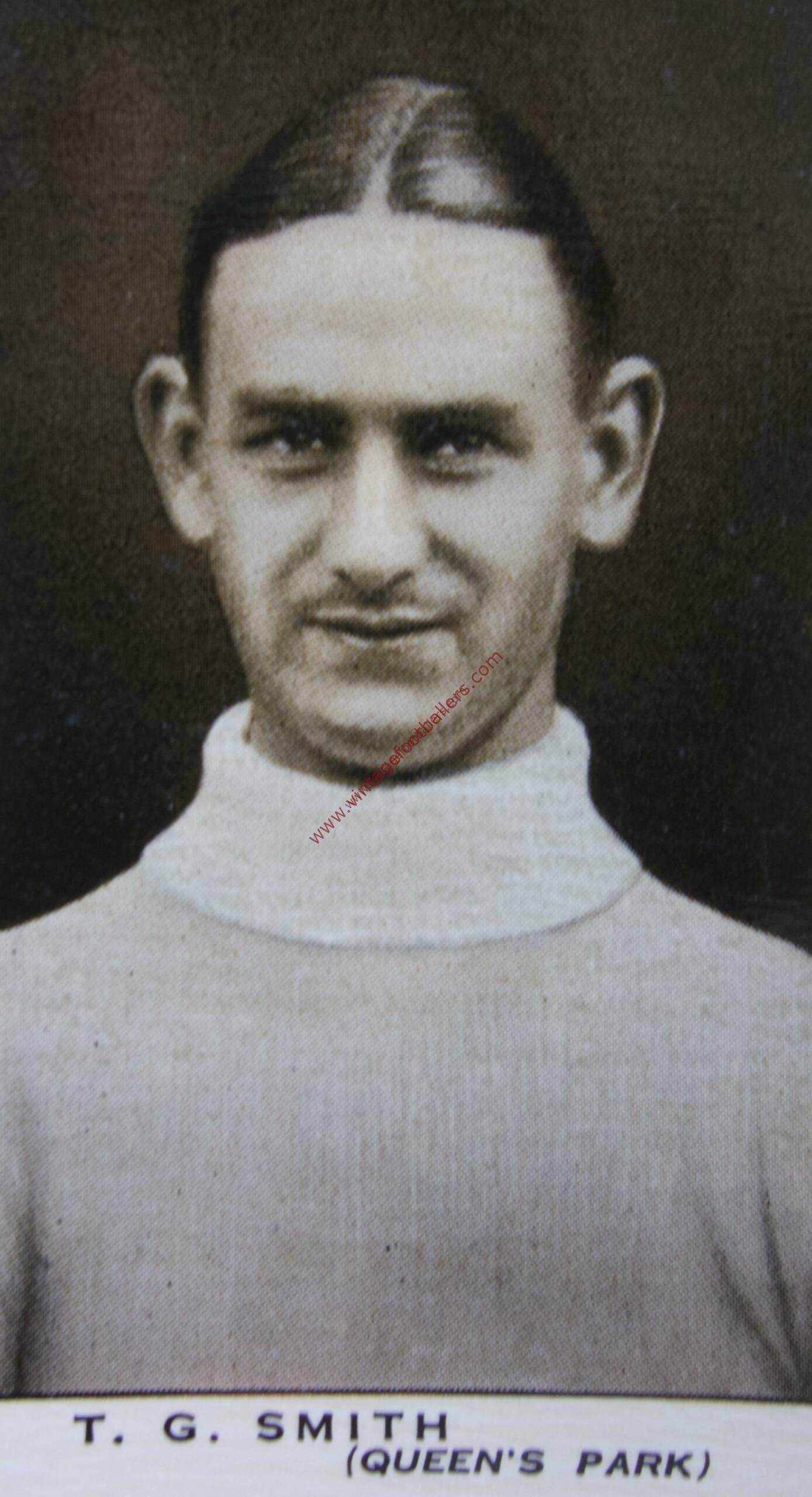 Goalkeeper TG Smith joined Queen’s Park from Shawlands Academy and was a regular in the Scottish amateur international XI while playing for Queen’s Park and subsequently Ayr United and St Bernard’s in the mid 1930’s. A tall goalkeeper for his time at 6 foot 2 inches, described at the time as “a giant”, he also represented The Scottish League against The Irish League in September 1933 in a 3-0 defeat at Windsor Park, Belfast. He was described thus: “A very safe type of goalkeeper, quick of hand and eye, Smith is a prime favourite at Hampden, and on quite a few occasions has been the hero of his side. His goalkeeping is sometimes very spectacular and provides a real thrill.”
