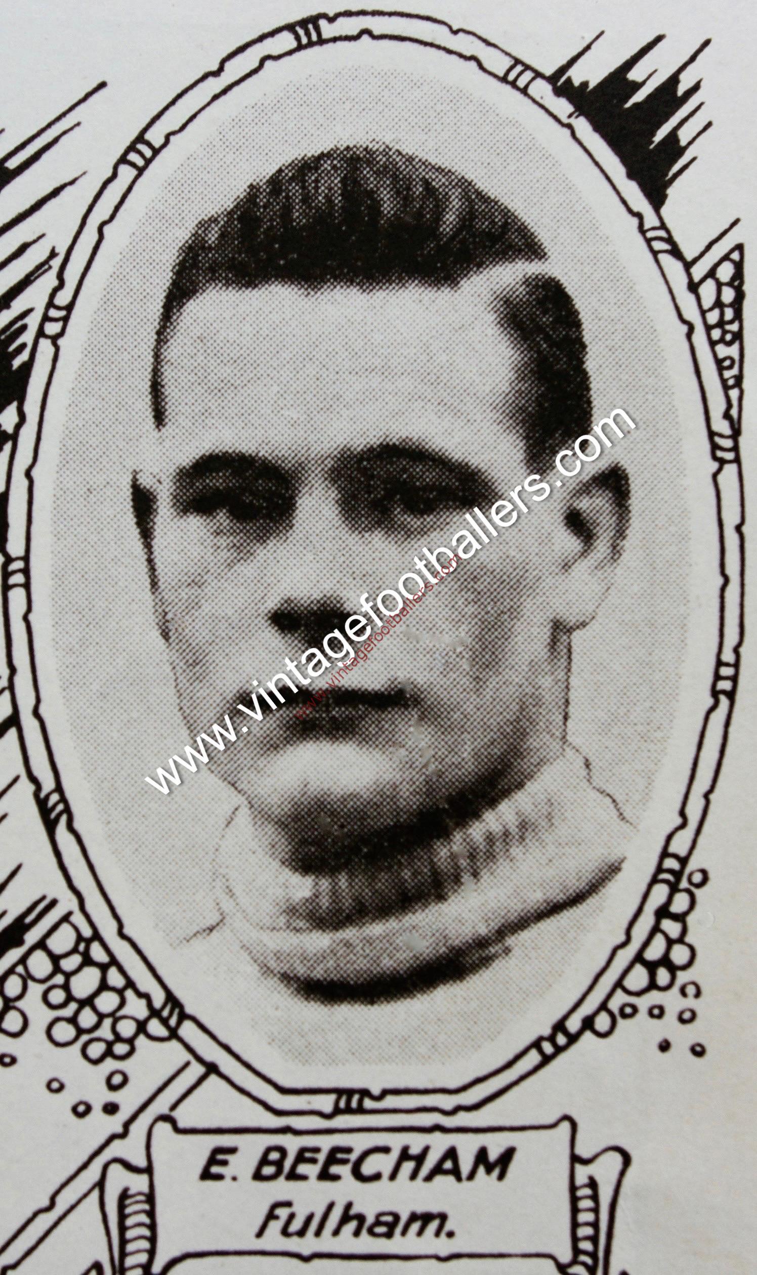 Hertford born goalkeeper Ernie Beecham began his football career with Ward End Works and played for Hertford Town in 1923 before signing for Second Division Fulham in November 1924, making his Football League debut at Blackpool in December 1925. He remained an ever present that season and for the following two seasons, indeed heĀ holds for the club record for consecutive appearances after a debut (130) and his run was only halted by a broken neck suffered against Exeter City in November 1928. Although he returned in 1929 to miss only 5 games in 1929-30, he became understudy to Jake Iceton and played only 9 games as Fulham won the Third Division (South) Championship in 1931-32 (The Cottagers having been relegated in 1928).