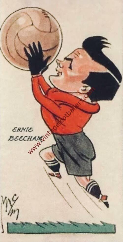 Hertford born goalkeeper Ernie Beecham began his football career with Ward End Works and played for Hertford Town in 1923 before signing for Second Division Fulham in November 1924, making his Football League debut at Blackpool in December 1925. He remained an ever present that season and for the following two seasons, indeed he holds for the club record for consecutive appearances after a debut (130) and his run was only halted by a broken neck suffered against Exeter City in November 1928. Although he returned in 1929 to miss only 5 games in 1929-30, he became understudy to Jake Iceton and played only 9 games as Fulham won the Third Division (South) Championship in 1931-32 (The Cottagers having been relegated in 1928).