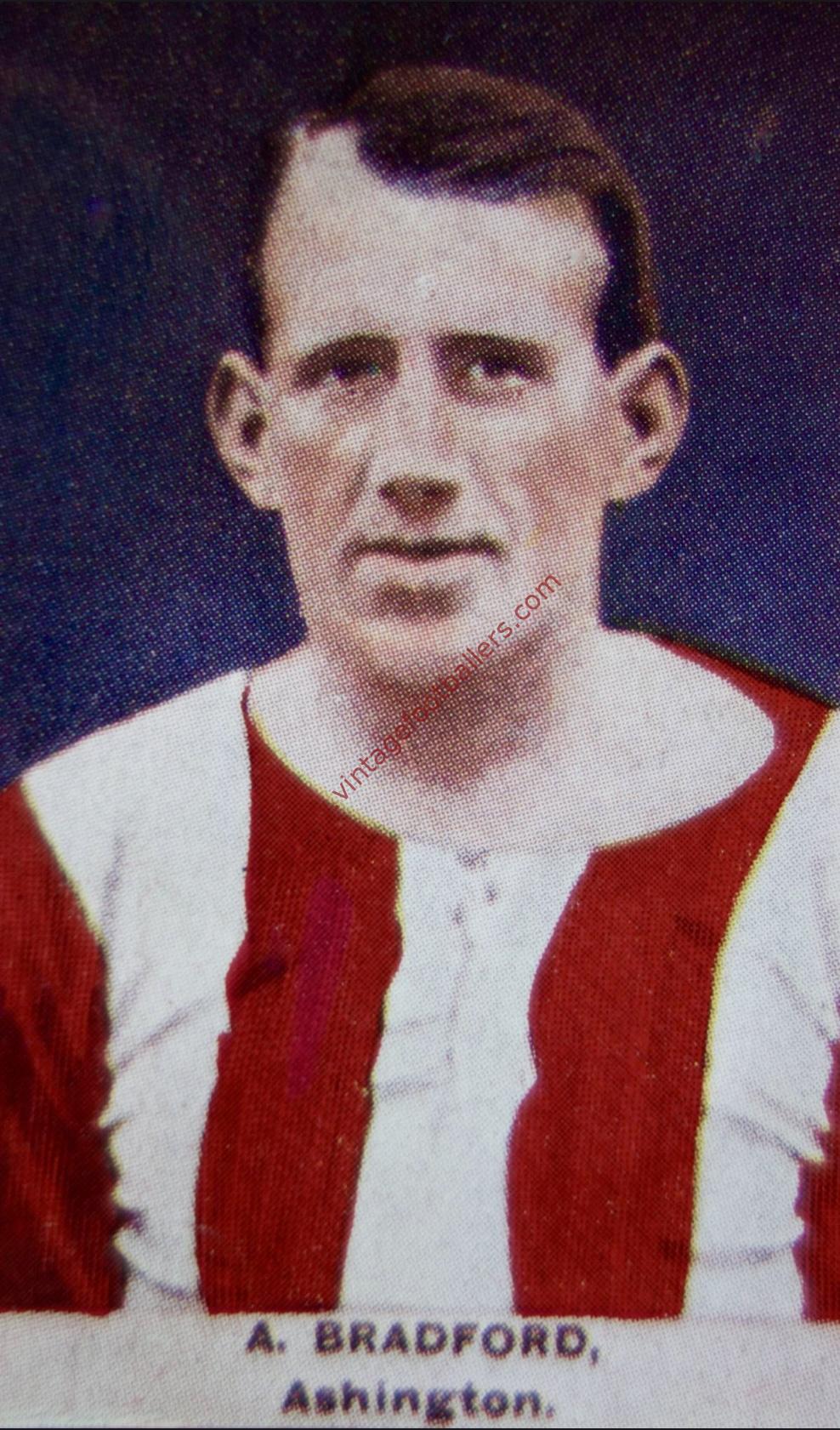 Broomhill, Northumberland born full back Alex Bradford played in local North East football for Broomhill in 1913 and East Chevington in 1914 before World War One, before joining Ashington after the War had finished in July 1919, playing in the North Eastern League and from 1921 the Third Division (North). Bradford made his Football League debut against Grimsby Town that August in Ashington’s inaugural League fixture, playing 34 games that season and scoring once as they finished a creditable 10th place. However he soon lost his place and played only sporadically in 1922-23, his 7 further games proved his last League appearances returning to non league football in 1923 playing thereafter for Amble in 1927, for East Chevington Black Watch in 1928, North Broomhill Welfare in 1929, Eshott in 1930 and Hauxley United in 1931.