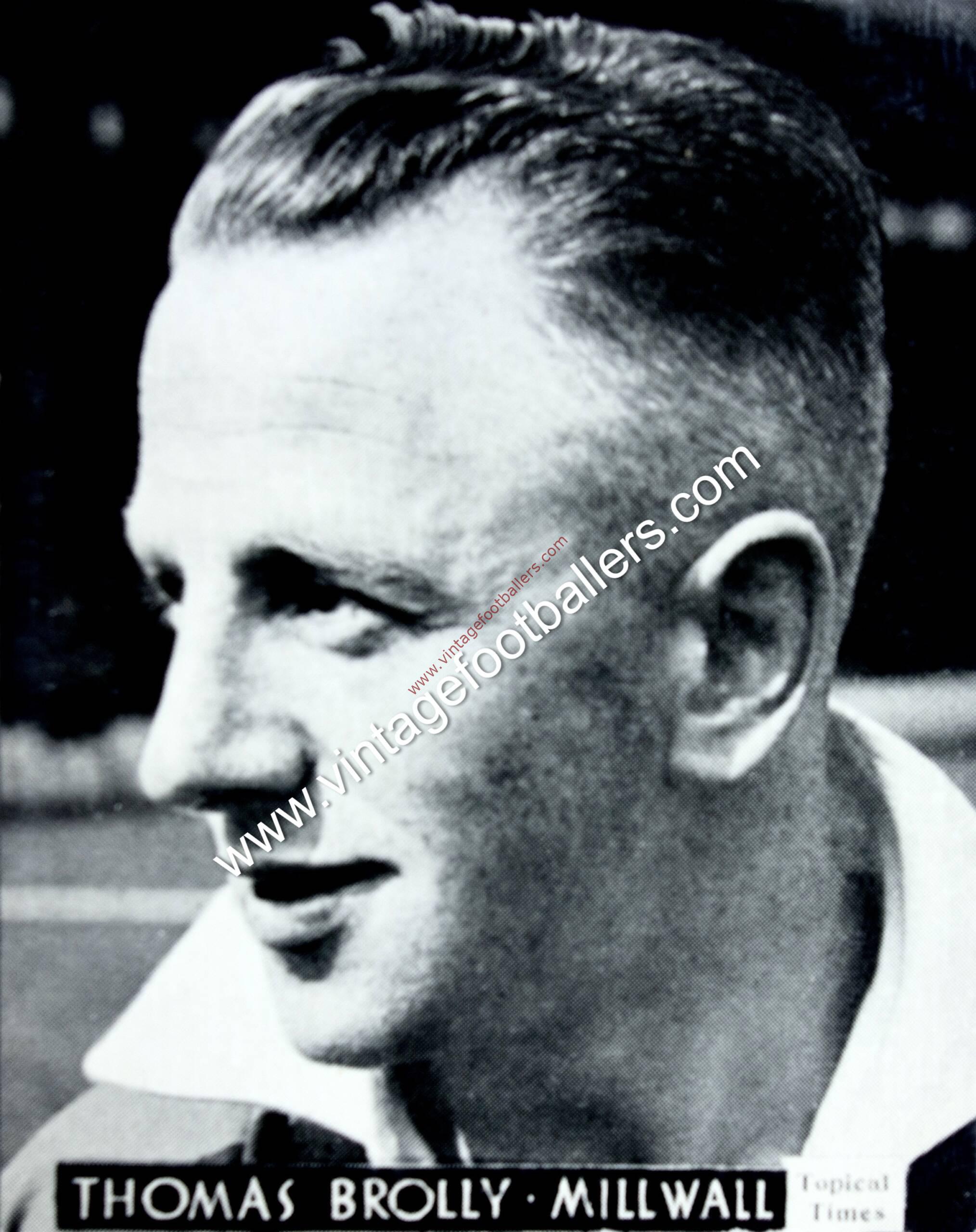 By the time a full League programme resumed Brolly was 34 years-old, and he returned to The Den, playing in their 1946 FA Cup campaign. Appointed captain at Millwall, he could do little to prevent their relegation from Division Two in 1948, making only 9 appearances, and he was released by the club at the end of the 1948-49 season. Brolly however refused to go, and he played an important role in steadying the team’s defence the following season, finally retiring in 1950 after 257 appearances for The Lions.