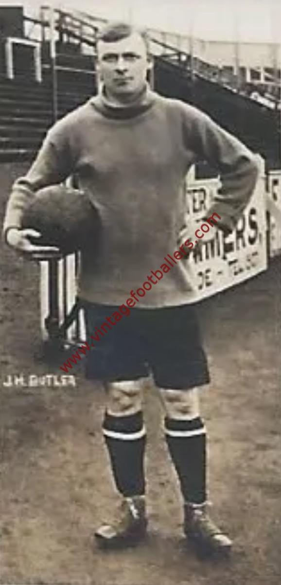 Butler joined Lincoln City in June 1914 playing 39 times during their 1914-15 campaign before the onset of the First World War causing the suspension of peacetime football interrupted his career, having made 3 short of 500 senior career appearances. During the War he appeared 4 times for Liverpool as a wartime guest in 1916-17 and twice more in 1917-18, and he also played for Stockport County. After the War he spent three years with Cheshire County League club Macclesfield Town from 1919 making 26 appearances, and finished his playing days with Vernon Park Amateurs, joining them in November 1922, before his eventual retirement.