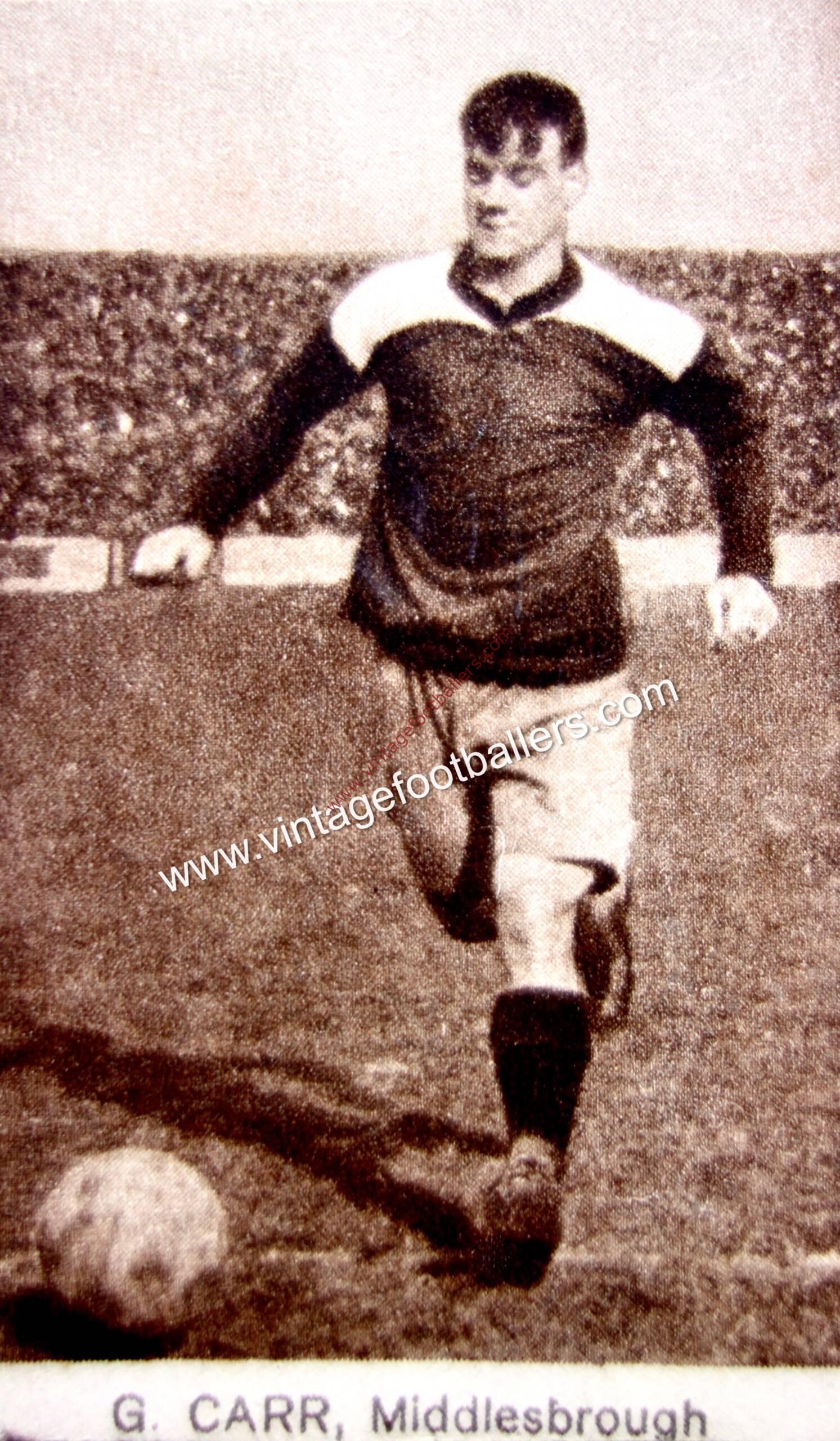 South Bank, Middlesbrough born inside forward George Carr played for South Bank East End in 1914 before signing for First Division Middlesbrough in 1919, making his Football League debut at Aston Villa the same November. At ‘Boro he scored 23 goals in 70 appearances over the next five years including a career season best 15 goals in 1921-22, which included hat-tricks against Aston Villa and Bolton Wanderers, before signing for Leicester City in February 1924.