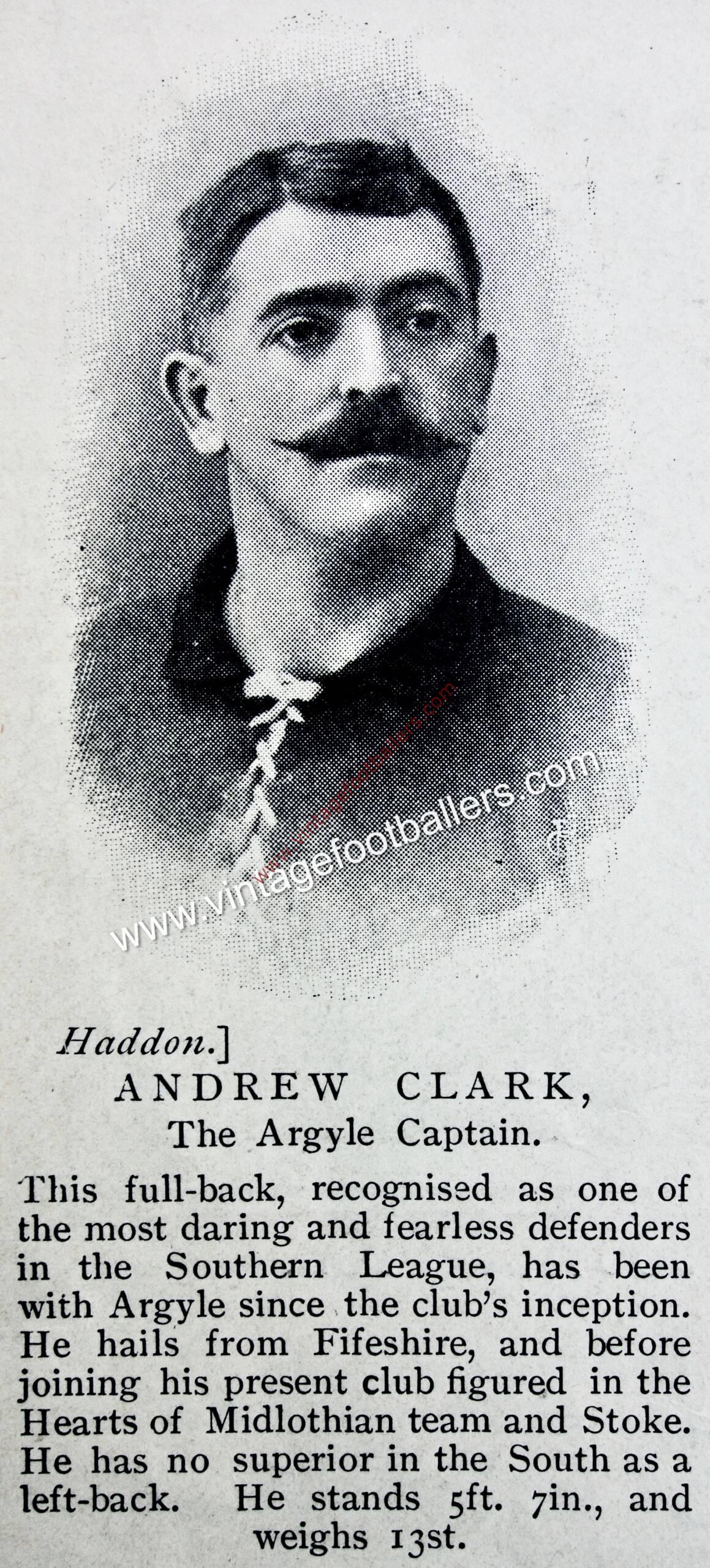 A Scottish junior international, Leith, Midlothian born left back Andy Clark began his football career with Hamilton Academical in 1897 and also had spells with Buckhaven United in 1898 and Heart of Midlothian for whom he made 39 appearances over two seasons from from August 1899 before heading south to join First Division Stoke in the close season of 1901, making his Football League debut against Bury that September. After two seasons, and 59 appearances for The Potters, he moved to Southern League Plymouth Argyle in the 1903 close season and was a key member of Argyle’s first professional side.