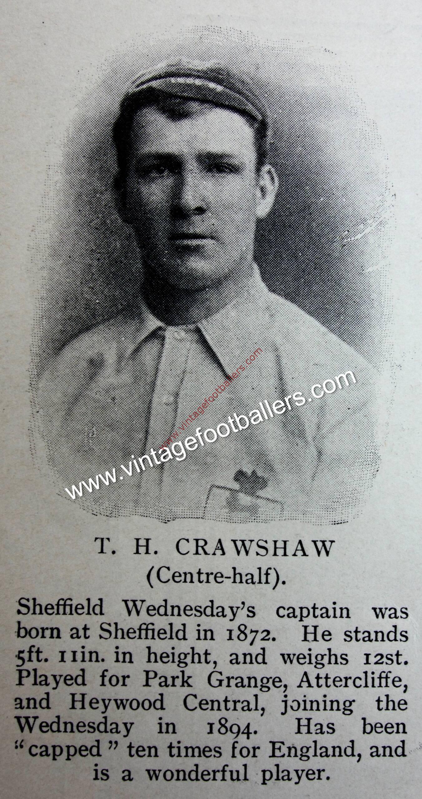 In the 1895-96 campaign Crawshaw was part of the Wednesday side which won the FA Cup, he played in all six ties, scoring in the 3-1 semi-final replay victory over Bolton Wanderers. However he did make an uncharacteristic mistake in the Final against Wolves when an error allowed David Black to equalise before Wednesday went on to win 2-1 through two Fred Spiksley goals.