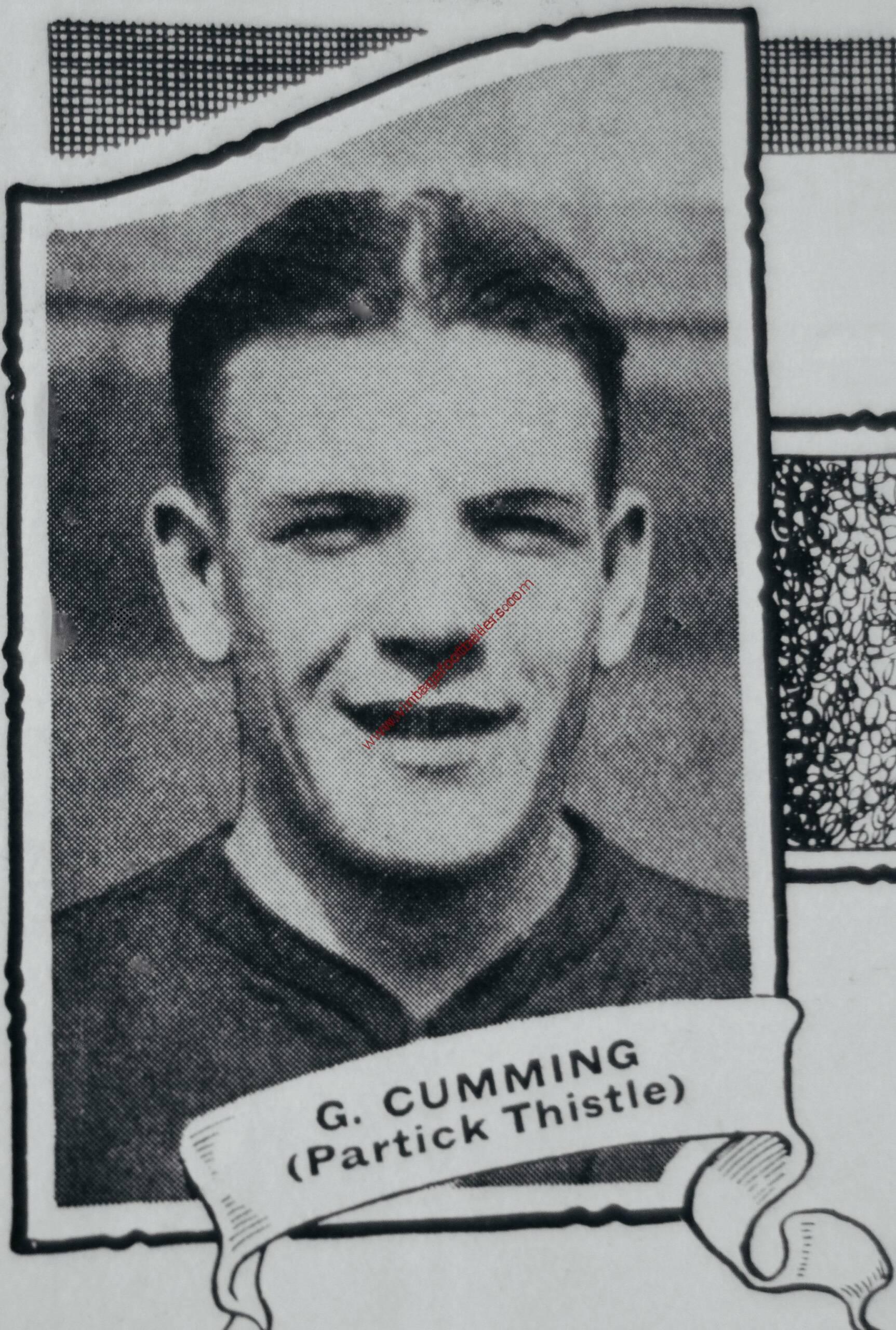 Thornbridge, near Falkirk, Stirlingshire born left back George Cummings started his career with Thornbridge Waverley in 1928 and Thornbridge Welfare in 1930, and played for Grange Rovers in 1931, joining Partick Thistle in 1932, having won junior international honours for Scotland aged 18. He represented The Scottish League in October 1934 and 1935, both times playing against The Irish League, and won the first three of 9 Scotland caps in 1935 while still a Partick Thistle player, making his Scotland debut against England in April 1935 and playing for Scotland until April 1938. He also represented the Scottish Football Association on their tour of the US and Canada while still a Thistle player.