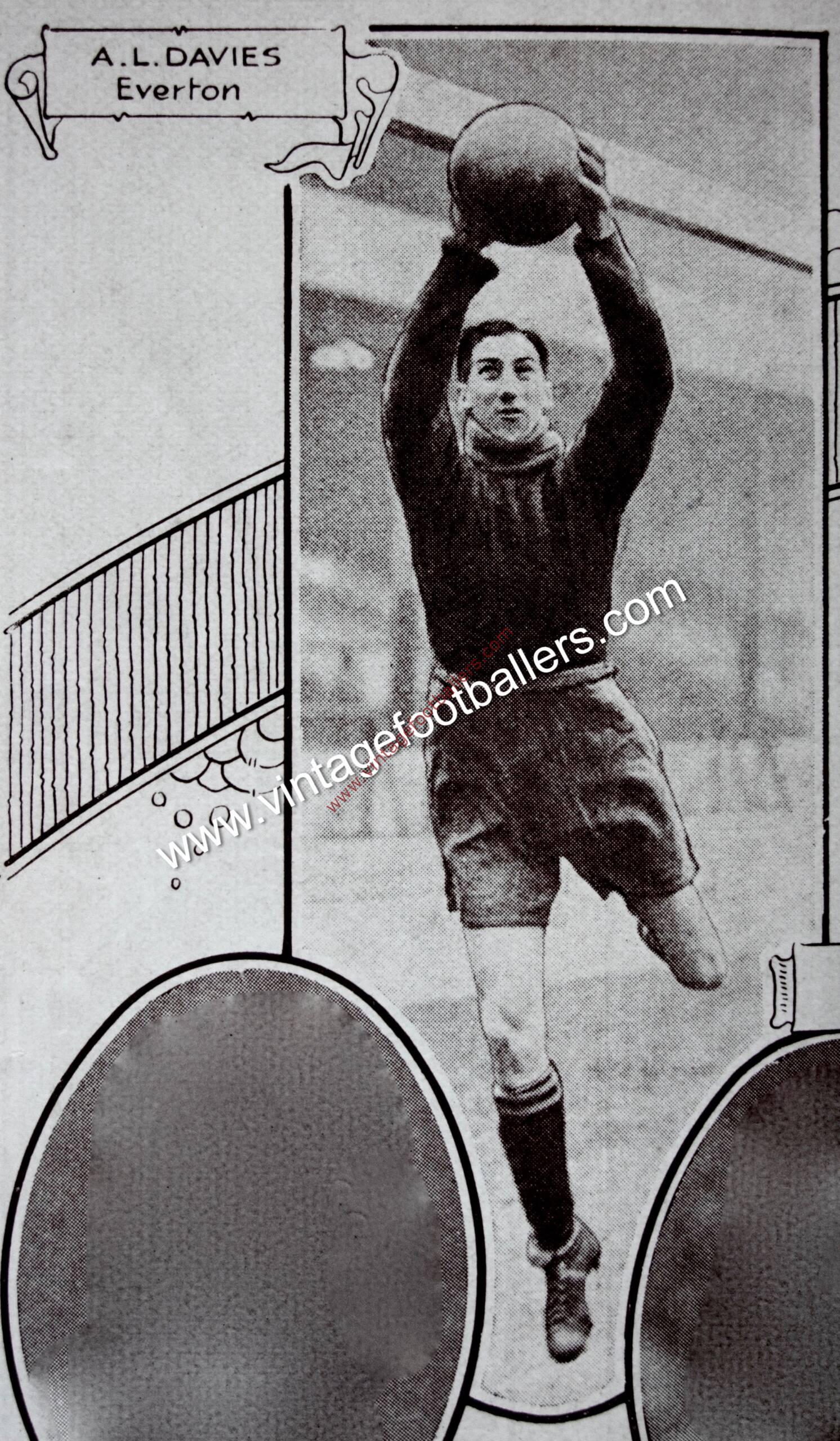 New Brighton, Cheshire born goalkeeper Arthur Davies began his football career began his football career with Harrowby and spent 1923-24 at hometown club New Brighton as understudy to the Mehaffy brothers, without making their first team. He then joined Flint Town from where he was signed by Everton in 1926, making his Football League debut at Huddersfield Town that October. Initially understudy to Ted Taylor and Howard Baker, he made 10 appearances in each of his first two seasons, the last 8 of which came from March to May 1928 helping Everton to seal the League Championship, whereupon he was an ever present in Everton’s 1928-29 campaign, also playing in their FA Charity Shield win over Blackburn Rovers at Old Trafford in October 1928. He was also selected for a Football League representative side against their Irish counterparts in a match played at Goodison Park in September 1929.