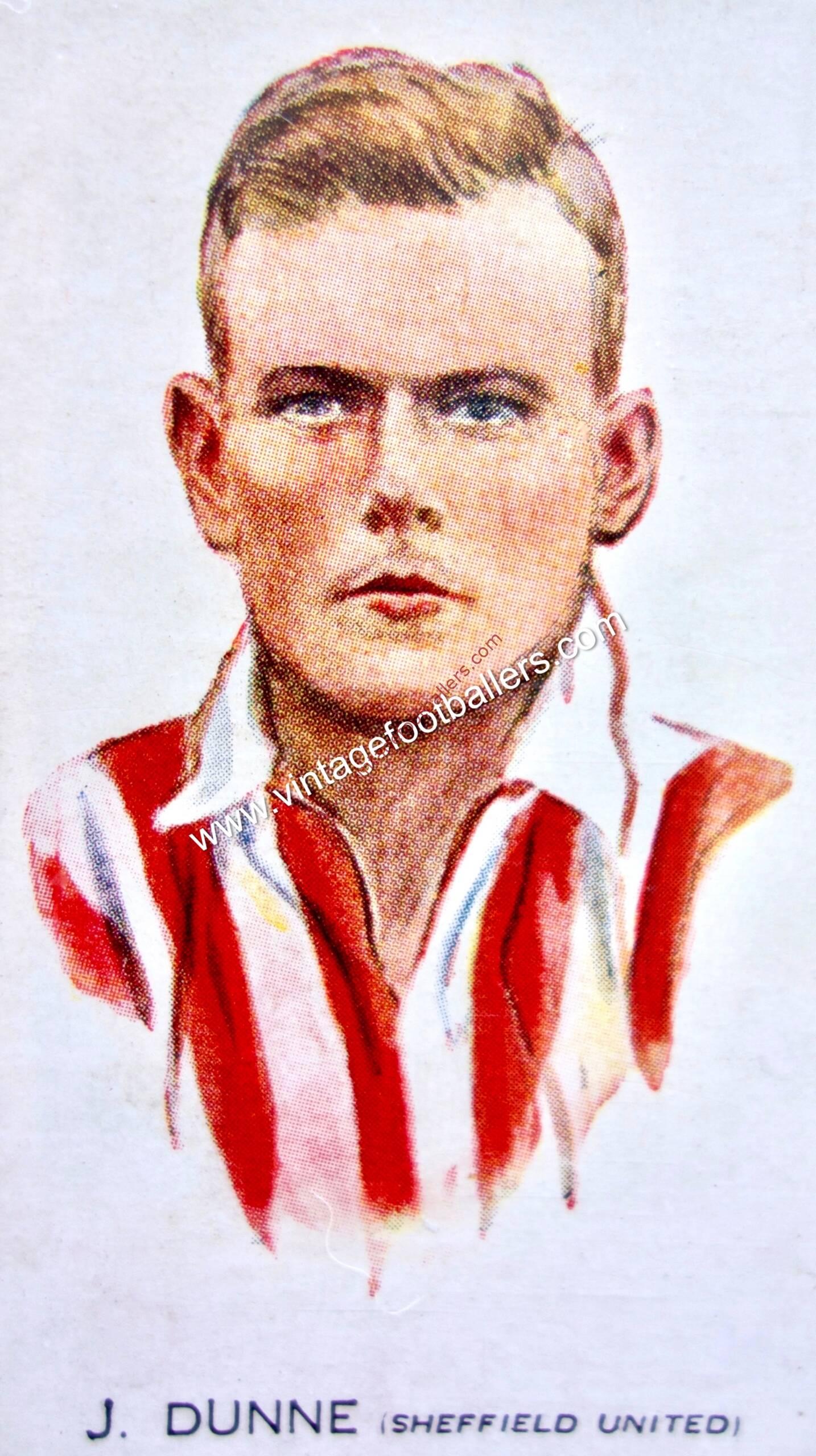 Born in the Ringsend area of Dublin, centre forward Jimmy Dunne played Gaelic football in his teens. He was imprisoned for IRA activities and went on hunger strike. It was during this time behind bars that he took to “soccer”, and on his release began playing junior football with a number of Dublin-based clubs including Park View in 1922 and Riverside Athletic in 1923, before joining Shamrock Rovers later in 1923. He left Rovers in October 1925 to sign with English Division Three (North) side New Brighton, making his Football League debut against Rochdale in early November, scoring in a 3-0 win, and he managed to find the net six more times in nine further matches prompting First Division club Sheffield United to buy him at the start of February 1926, only three months later.