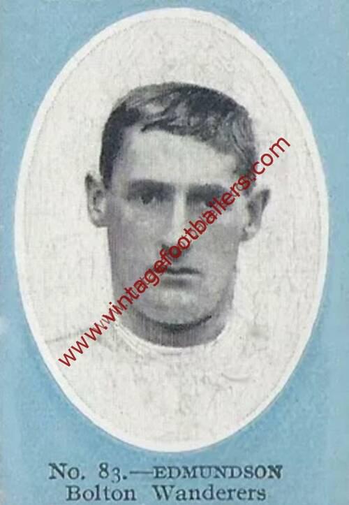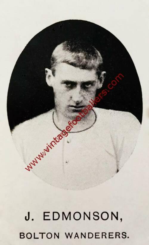 Accrington, Lancashire born goalkeeper John Edmondson joined hometown Lancashire Combination club Accrington Stanley in 1901 from where he was signed by Second Division Manchester City, for whom he made his Football League debut against Arsenal in December 1902. Initially understudy for three seasons to Jack Hillman making just 12 appearances over that time, he took over the gloves in 1905-06 making 28 appearances, but moved to Bolton Wanderers in the close season of 1906, where he initially shared responsibilities with Dai Davies before becoming the principal goalkeeper from 1908.