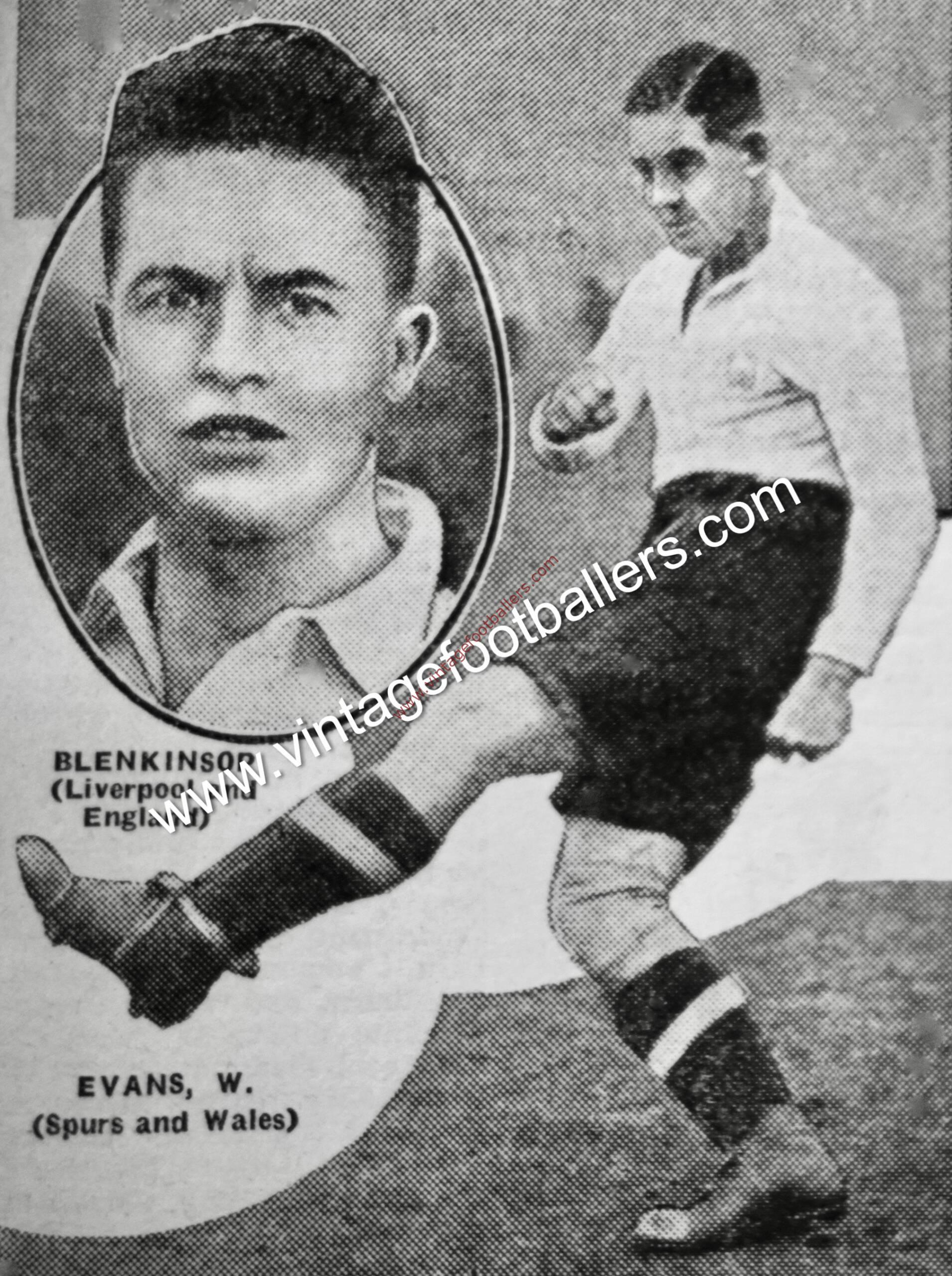 Evans won 6 caps for Wales, making his debut alongside Spurs teammate Eugene O’Callaghan in the 4-1 win over Ireland at The Racecourse Ground, Wrexham in December 1932 that sealed their British Championship success and scoring his only international goal against Scotland the following October as Wales retained the Championship. His final cap came against the same opponents in a 3-2 defeat at Celtic Park, Belfast, in March 1936.