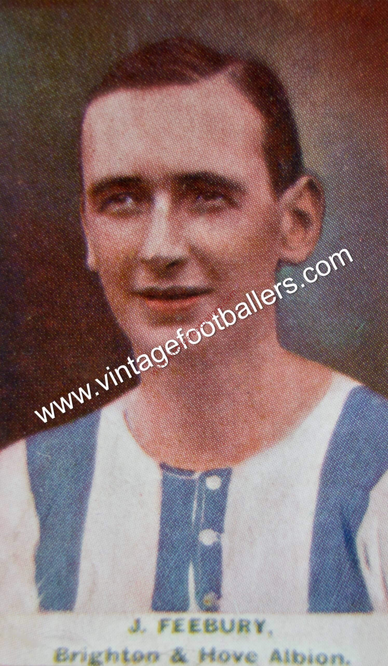 Hucknall, Notts born full back Jack Feebery signed for First Division Bolton Wanderers from Bulwell White Star making his debut against Arsenal in September 1909. His career at Bolton lasted over 10 years and despite the interruption of World War One he scored 16 goals in 192 games for The Trotters (half his goals being scored from the penalty spot). Having played most of the earlier matches in Bolton’s resumption season when peacetime football returned, he lost his place in the Bolton team in February 1920 and in the summer of 1920 he joined Division 3 (South) Exeter City where he was an ever present in their inaugural Football League season. However he spent only one year in Devon moving to Brighton the following summer. Although he was ever present in his first season, already in his mid 30’s he lost his place in the team towards the end of 1922 and only made occasional appearances thereafter, and by the time he joined non league Mid-Rhondda United in 1924 he had scored 3 goals in 67 appearances for The Seagulls. He was the elder brother of Albert Feebery who played for Coventry City and Crystal Palace, and his youngest brother Alf played for Notts County and Bristol Rovers in the 1930’s. Additionally 3 brothers played reserve team football at various clubs.