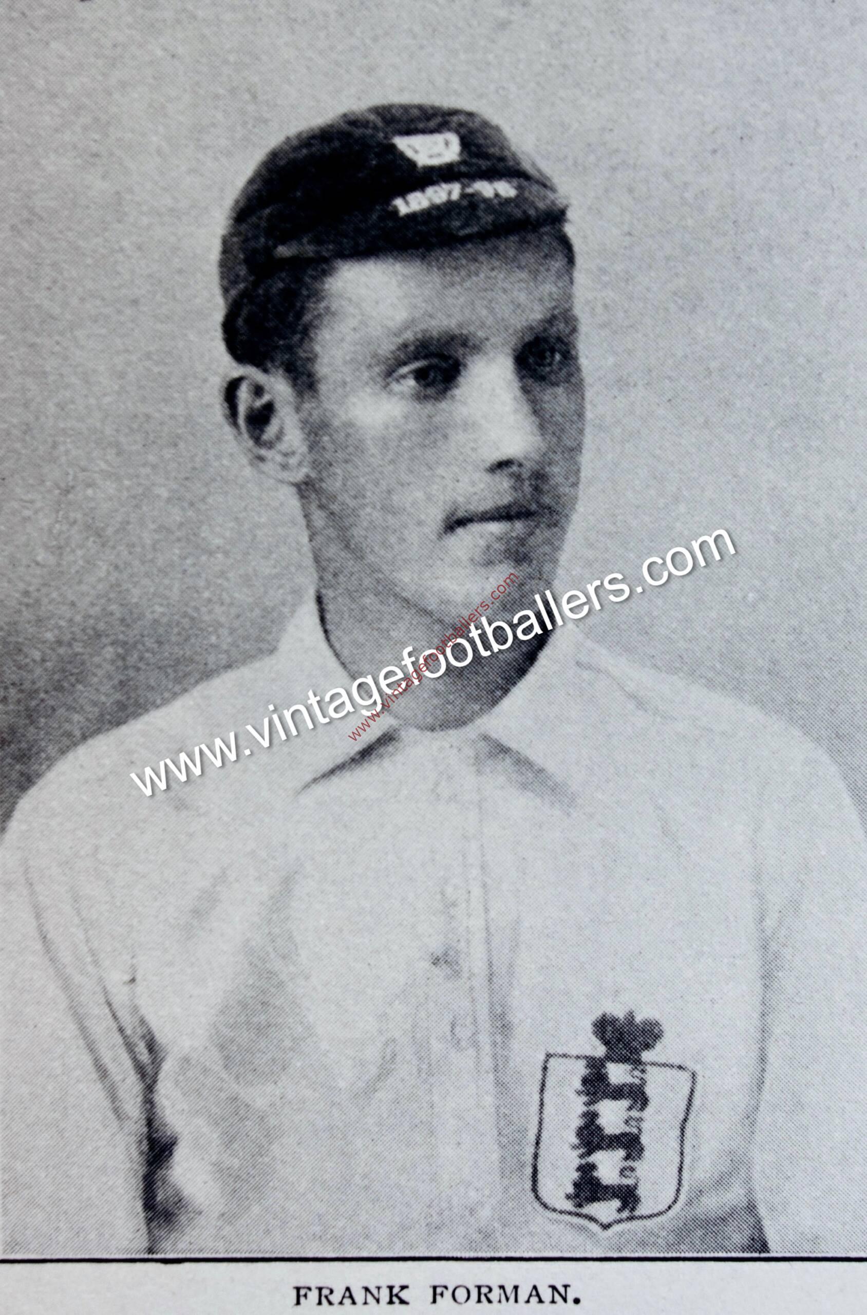 Right half Frank Forman was born in Aston-upon-Trent, Derbyshire, the younger brother of Fred Forman and uncle to future England goalkeeper Harry Linacre, and all three followed a similar career path. Forman played youth football for the local village side Aston-upon-Trent in 1891 before moving up to Beeston Town in 1892, where he was spotted by Derby County. County signed him in March 1894 and he made his Football League debut against Nottingham Forest in September 1894, but after making only eight appearances he was transferred to East Midlands rivals Nottingham Forest in December 1894.
