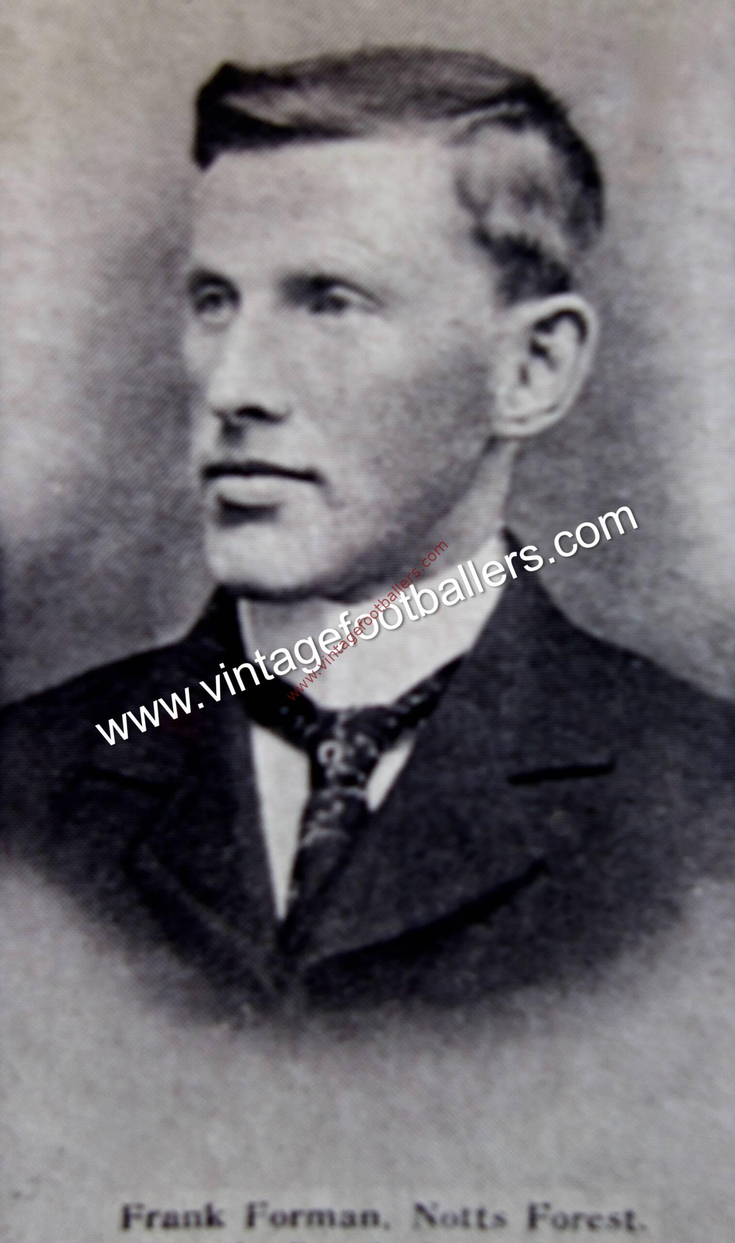 Right half Frank Forman was born in Aston-upon-Trent, Derbyshire, the younger brother of Fred Forman and uncle to future England goalkeeper Harry Linacre, and all three followed a similar career path. Forman played youth football for the local village side Aston-upon-Trent in 1891 before moving up to Beeston Town in 1892, where he was spotted by Derby County. County signed him in March 1894 and he made his Football League debut against Nottingham Forest in September 1894, but after making only eight appearances he was transferred to East Midlands rivals Nottingham Forest in December 1894.