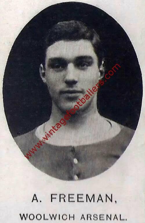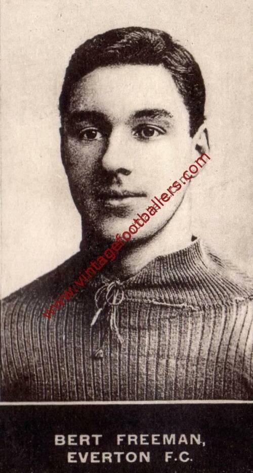 He left Aston Villa without ever having appeared in claret and blue, signing for Woolwich Arsenal in November 1905, making his Football League debut at Nottingham Forest that November, scoring in a 3-1 defeat, followed by a brace on his home debut in a 2-0 win over Manchester City. At Arsenal he scored 24 goals in 49 appearances over the next three years before Everton paid £350 for his services in April 1908. Freeman made his debut against Liverpool the same month and he soon began to blaze a trail that would see a return of 65 goals in 94 appearances over the next three years, being part of the team that finished runners up in the League Championship in 1909, with Freeman scoring 36 goals in the campaign, with two hat-tricks against Sheffield United and a further treble against Chelsea. The following season he scored 26 goals including hat-tricks in 3-1 wins over both Sheffield Wednesday and Bolton Wanderers, and was part of Everton’s 1910 FA Cup semi final team that lost in a replay to Barnsley.