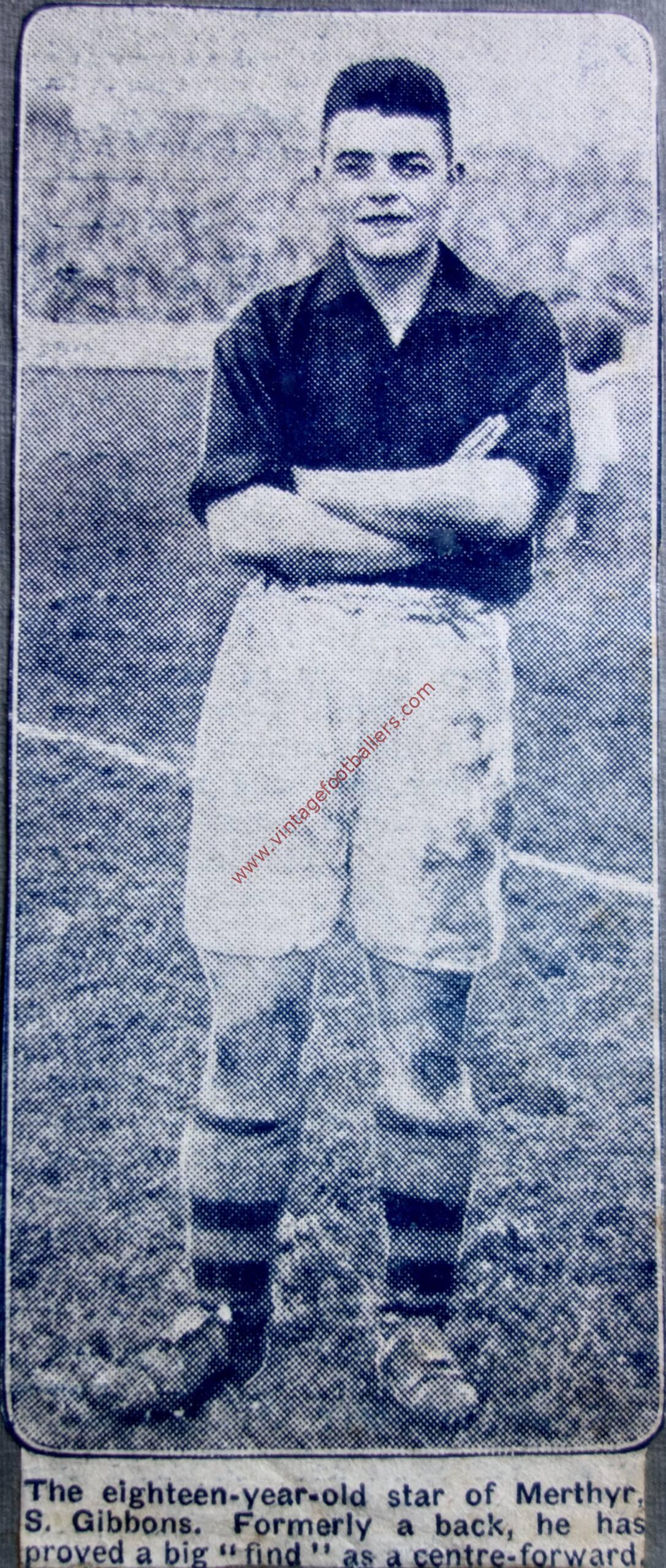 Merthyr Tydfil, Glamorgan born right back and sometime centre forward Samuel “Sonny” Gibbon began his football career on the books of Merthyr Town, where his father was the club Chairman, in 1925-26 as a full back, but he didn’t make their first eleven and moved to Aberdare Athletic in 1926, where again he failed to make the first team in their final League season. He returned to Merthyr Town, making his Football League debut in a Division Three (South) fixture against Brighton & Hove Albion in August 1928, still as a full back, playing 8 games in that position before converting into a centre forward in November 1928, scoring 13 goals in a further 19 appearances for Merthyr before being sold to Fulham for £700 in March 1929.