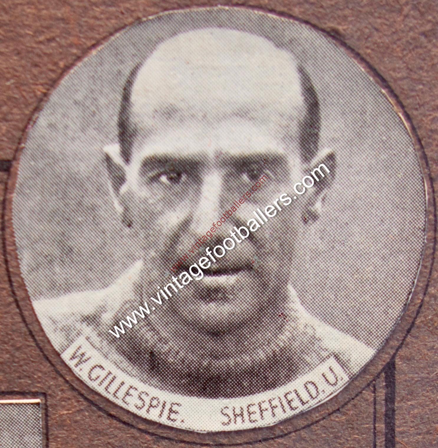 In  his third season with Sheffield United he was part of The Blades’ team that narrowly lost the 1914 FA Cup semi final, 1-0 in a replay to eventual winners Burnley at Goodison Park. A broken leg in September 1914 received in the first game of the season against Sunderland prevented him from playing all season and he unluckily missed the 1915 FA Cup Final win over Chelsea, the so called “Khaki Cup Final” immediately before the onset of the First World War forced the suspension of peacetime football. During the War Gillespie played initially frequently for Sheffield United in wartime league football and then only occasionally as he served as a gunner in the Army, and it was in this time that he lost most of his hair.
