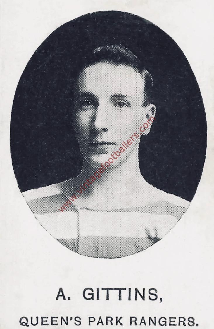 Manchester born centre forward Alfred Gittins began his football career with Adlington and spent 1903-04 on the books of First Division club Bolton Wanderers without making their first eleven. He then joined Second Division club Blackpool in August 1904, still an amateur, making his Football League debut and only appearance for The Seasiders against West Bromwich Albion in September that year, but he drifted back into non league football with Atherton Church House in 1905 before heading to The Southern League to join Luton Town in May 1906. After a season at Kenilworth Road, where he scored 5 goals in 27 appearances, he joined Queen’s Park Rangers in May 1907 where he won a Southern League Championship medal in 1907-08, finishing as Rangers’ joint top scorer with 16 goals in their triumphant campaign, and before the season end he played in their FA Charity Shield match, the first such match in its history, when they drew 1-1 with League Champions Manchester United at Stamford Bridge.