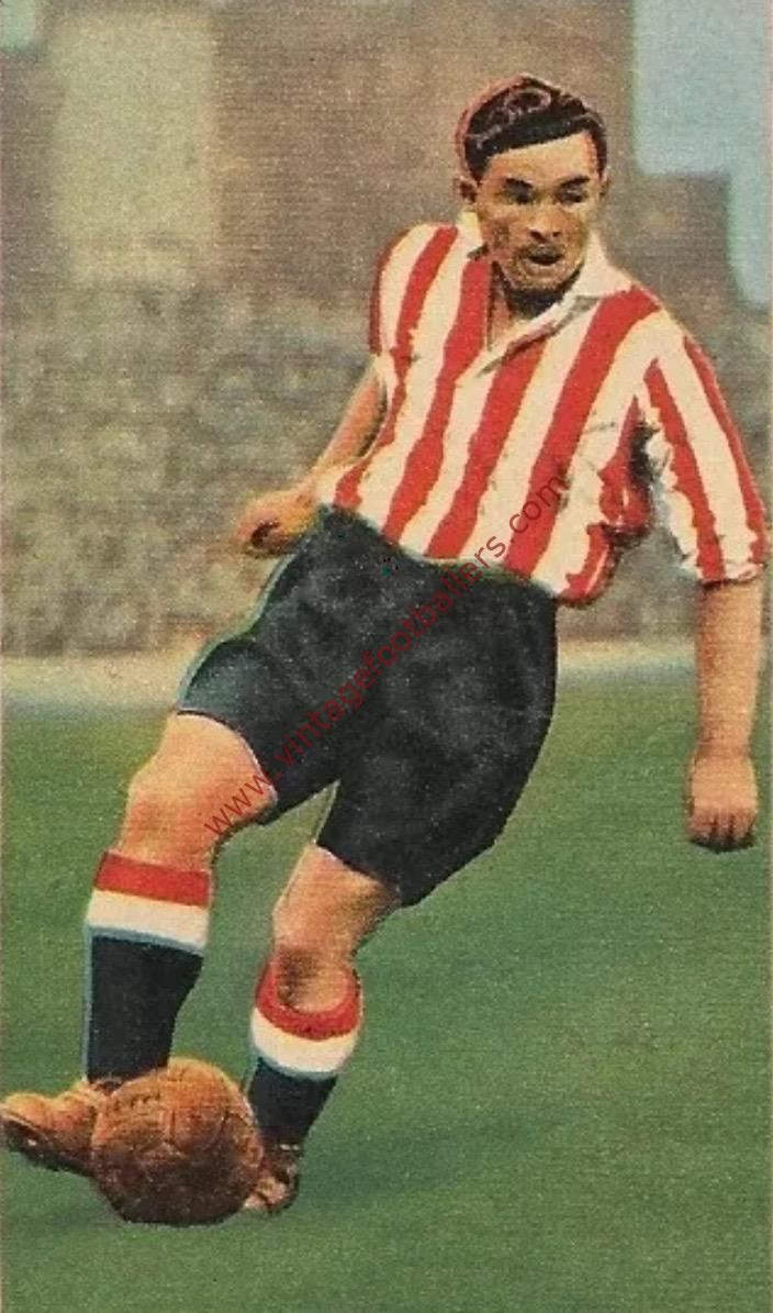 After the War, Hagan initially refused to re-sign for United, missing the first four games of the 1946-47 season. Having got a job as a trainee chartered surveyor he only rejoined the team on a part-time basis. A two-footed inside forward with an astonishing repertoire of tricks, Jimmy was also a regular goalscorer and he was selected for his only England cap in September 1948 in a 0-0 draw against Denmark in Copenhagen, having played the previous year in an unofficial England “B” international against Switzerland in Geneva. Â He also toured Australia with the FA party in 1951.