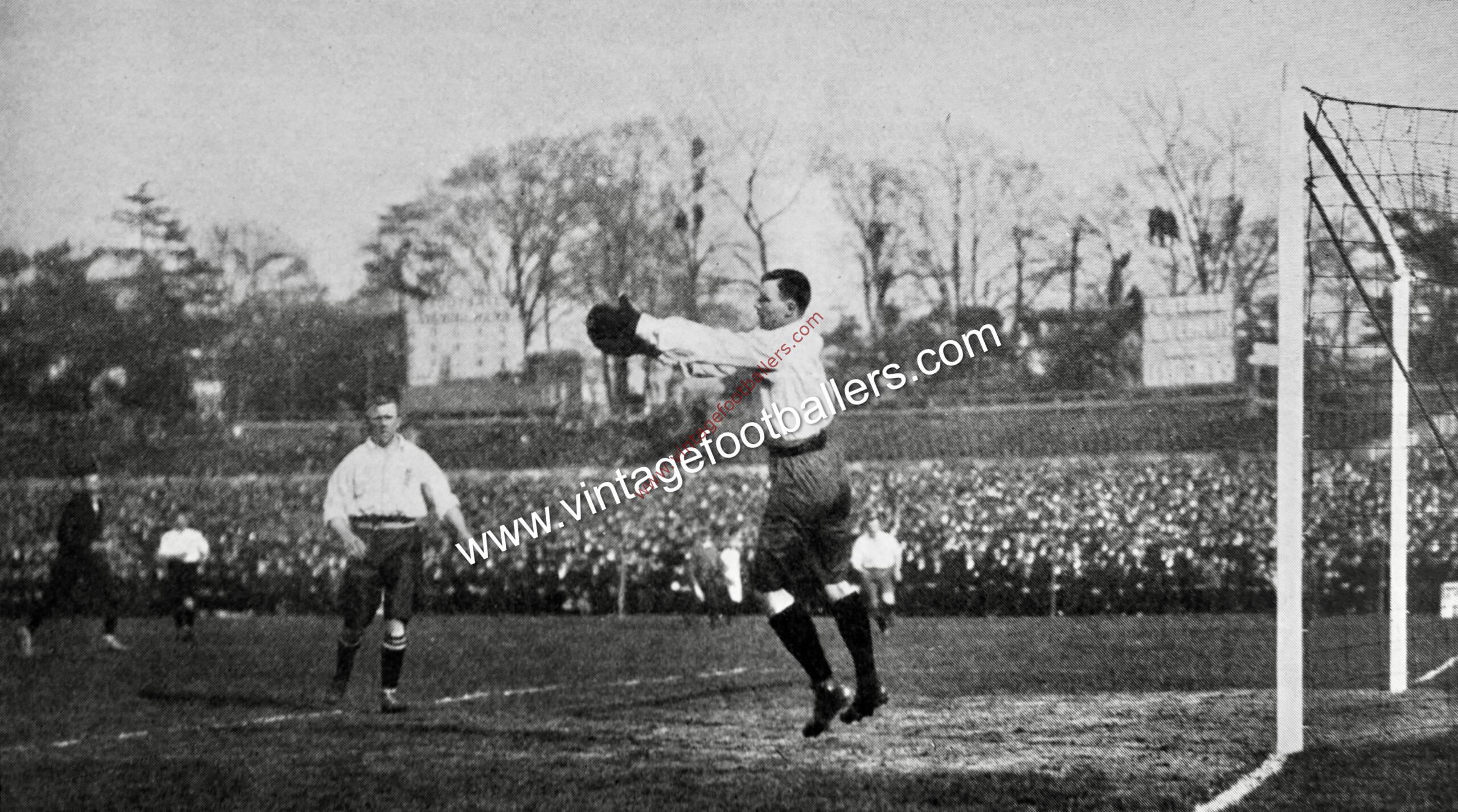 NB this photograph shows Hardy catching the ball while playing for England at The Crystal Palace. The opponents and year are hard to identify from the photograph, as the other England player, West Bromwich Albion full back Jesse Pennington, played several times with Hardy for England, so the year is a guestimate.