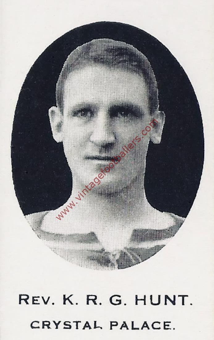 Oxford born left half The Reverend K.R.G. (Kenneth) Hunt had previously attended Wolverhampton Grammar School and won four Blues for football at Oxford University between 1904 and 1907, and had first played for the famous amateur club The Corinthians, for whom he made his senior debut when he played in The Sheriff of London Charity Shield match against Liverpool at Craven Cottage in April 1906. Joining Second Division club Wolverhampton Wanderers as an amateur, he made his Football League debut against Burnley in March 1907. The same month he was selected by England for the first time for the match against Wales at Craven Cottage but was a non playing reserve.