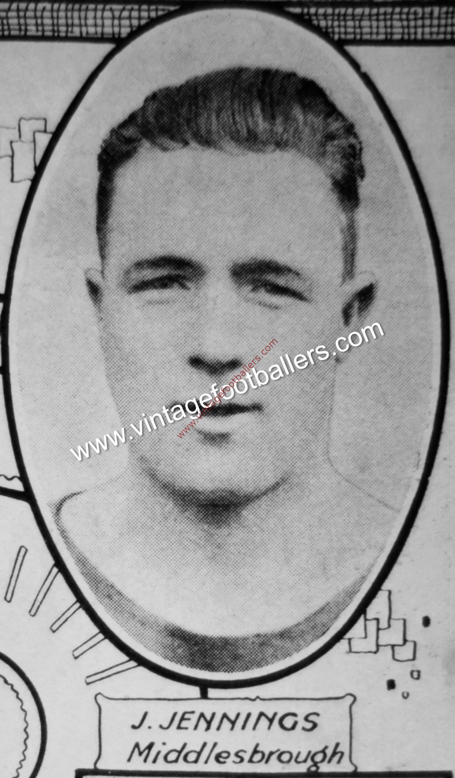 Jennings spent several years as club captain at Middlesbrough, eventually relinquishing the role to Tom Griffiths following his arrival from Bolton Wanderers in 1933, and was selected in an FA XI for the Tour of Canada in 1931. After 10 goals in 205 appearances for Middlesbrough he joined Preston North End in September 1936, staying only 6 months at Deepdale, scoring once in 20 appearances, before he signed for Bradford City in March 1937. He made 34 appearances for The Bantams and then hung up his boots in the summer of 1938.
