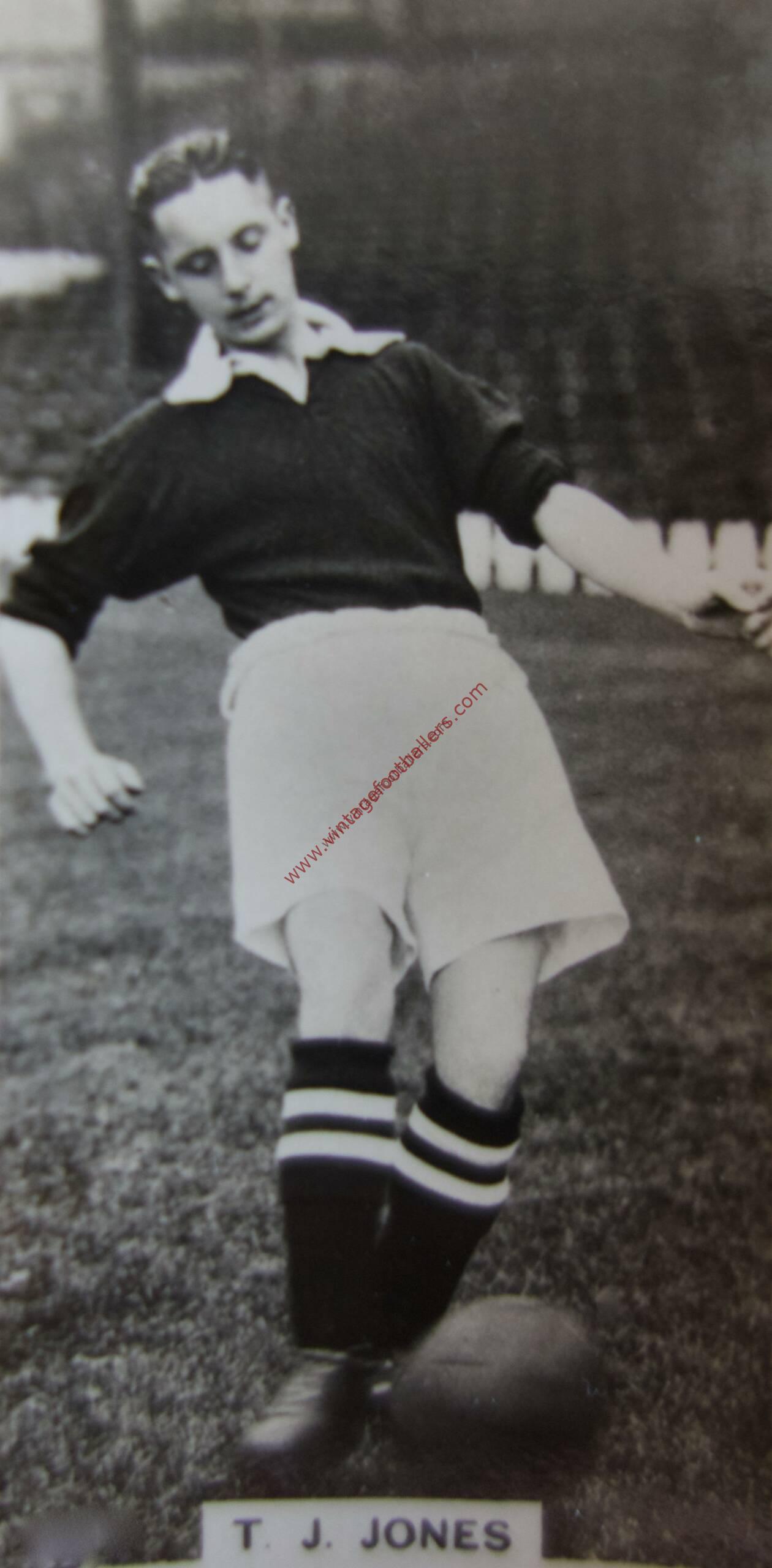 Penycae, Wrexham born left back Tom Jones began his football career with Rhosymedre in 1919, playing for junior clubs Acrefair, Druids, and in 1922 Birmingham & District League side Oswestry Town, from where he was signed by Second Division club Manchester United in 1924, making his Football League debut at Portsmouth that November, helping United to gain promotion that season as Second Division runners up.
