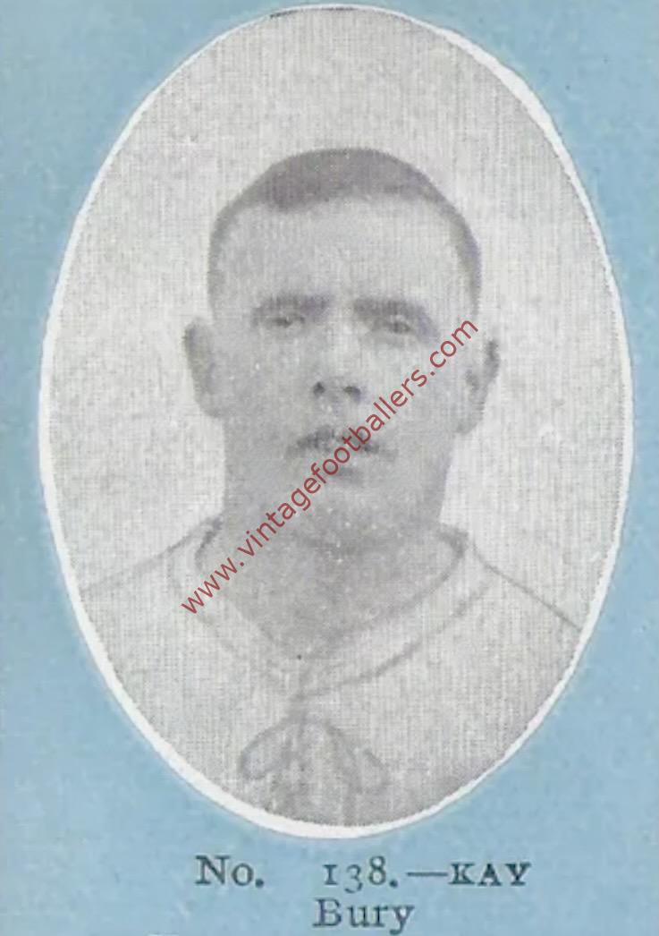 Ramsbottom, Lancashire born inside left Tom Kay started his football career on Blackburn Rovers’ books in 1902-03 but didn’t make their first eleven, joining Nelson in 1903. From there he joined First Division Bury in 1904, making his Football League debut against Newcastle United in March 1905, becoming an established member of the first team from March 1906. He scored his only hat-trick against Liverpool in March 1908 in a season when he scored 16 goals, second in the club’s scoring roster behind Billy Hibbert. He continued to play for Bury until the end of the 1913-14 season, playing his last match in April 1914 at Wolves, by when he had scored 77 goals in 231 matches for The Shakers across ten seasons.