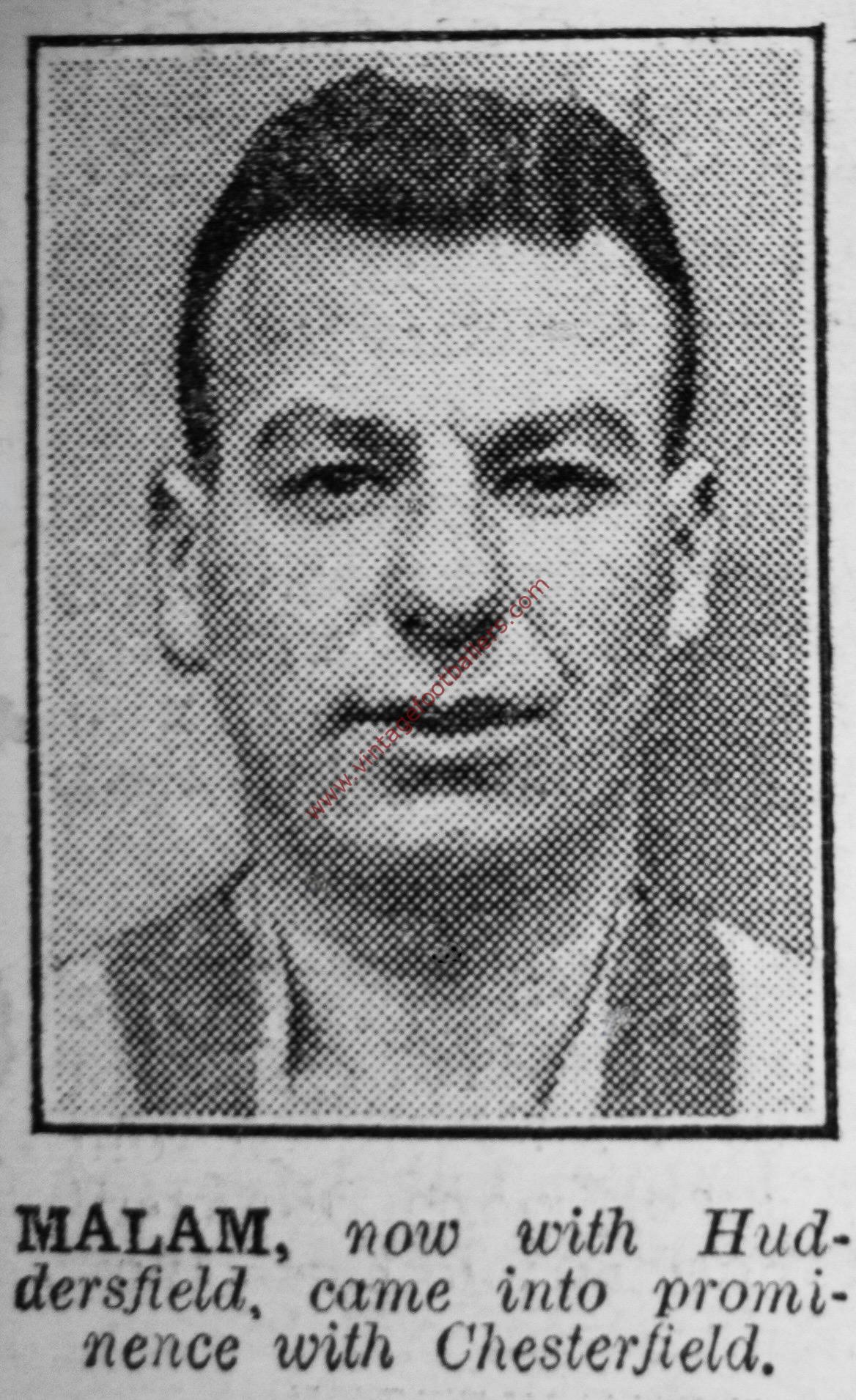 Liverpool born inside left Albert Malam began his football career in local Liverpool football and had a trial with Everton in 1930 before joining Colwyn Bay United, from where he signed for Second Division club Chesterfield in November 1932, making a scoring Football League debut against Grimsby Town the next month. He scored 4 goals at Charlton Athletic the following May but it was not enough to save Chesterfield from relegation. His 15 goals the next season brought him to the attention of First Division club Huddersfield Town, who signed him in September 1934 after 26 goals in 61 matches for The Spireites.