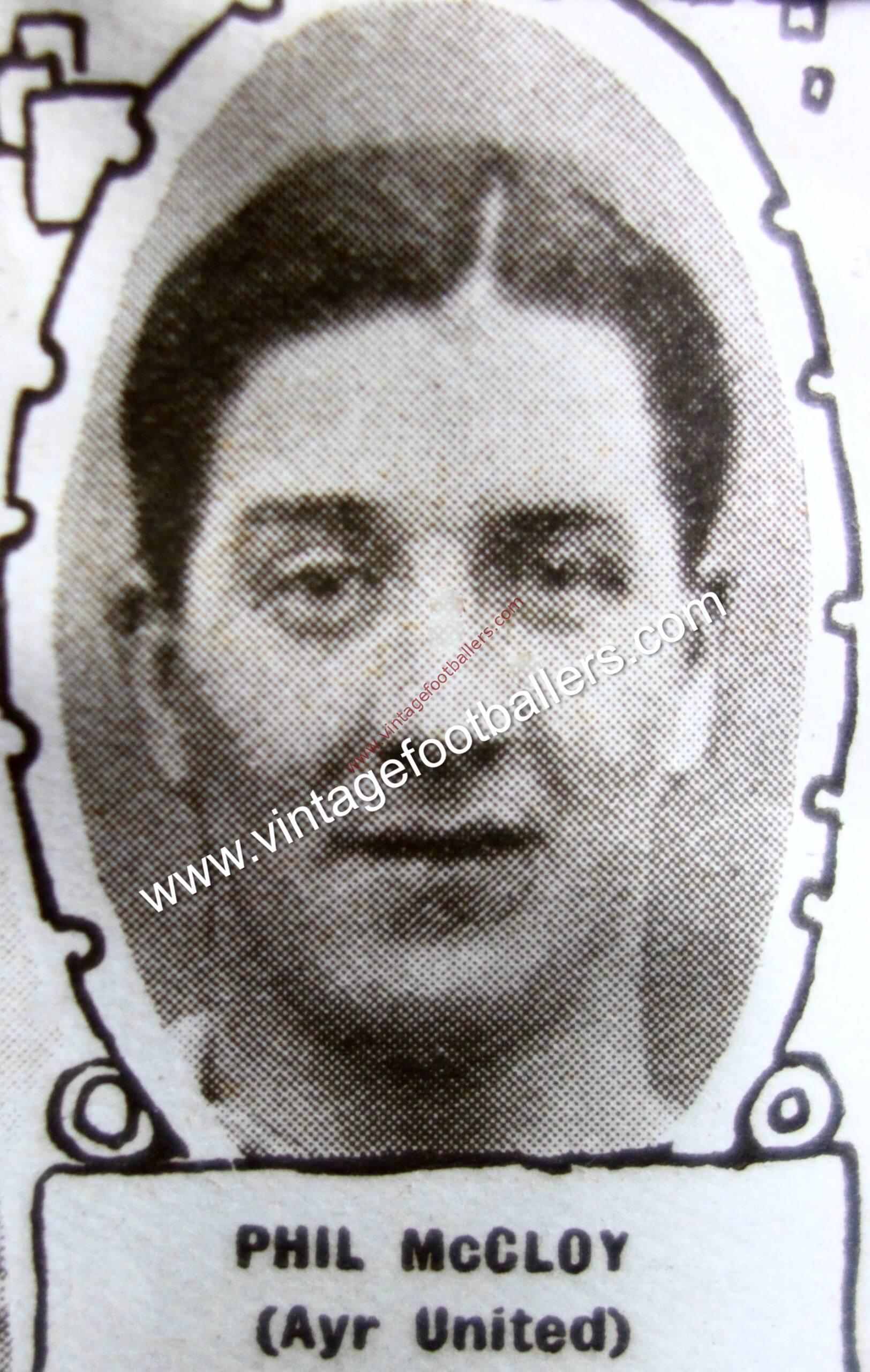Uddingston, Lanarkshire born left back Philip McCloy played junior football for Baillieston Juniors in 1911, Mossend Hibernian in 1912, Kilsyth Emmet in 1913 and Parkhead Juniors in 1914 before he joined Scottish League Ayr United in 1918, going briefly on loan to Clyde the same year, where he made a single appearance for The Bully Wee. He spent seven years at Somerset Park, scoring 8 goals in 248 appearances for The Honest Men, during which time he won two international caps for Scotland, being first selected to play against England in a 1-1 draw at Wembley in April 1924 and then playing a year later in the same fixture which ended a 2-0 Scotland win at Hampden Park.