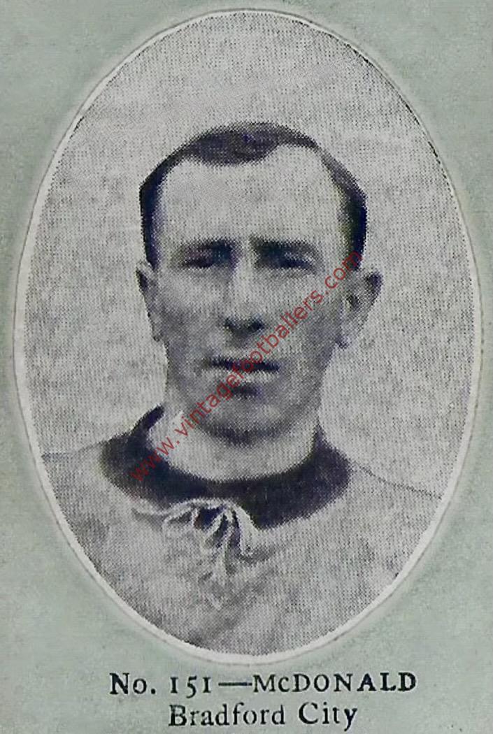 Peterhead, Aberdeenshire born inside left and later left half Jimmy McDonald began his football career, initially as a forward, with Inverness Citadel in 1901, joining Inverness Thistle in 1902. He played for Aberdeen Favourites in 1903 before joining Scottish League St Bernard’s in 1904, from where 3 years later he signed for Second Division Bradford City. He made his Football League debut against Burton United in April 1907, scoring on his debut in a 2-3 home defeat.The following season he scored 13 goals in 36 League appearances as Bradford City won the Second Division Championship. It was on this promotion that he converted to wing half and McDonald would go on to play both sides of the First World War for The Bantams, scoring 26 goals in 228 appearances, captaining the club before the War.