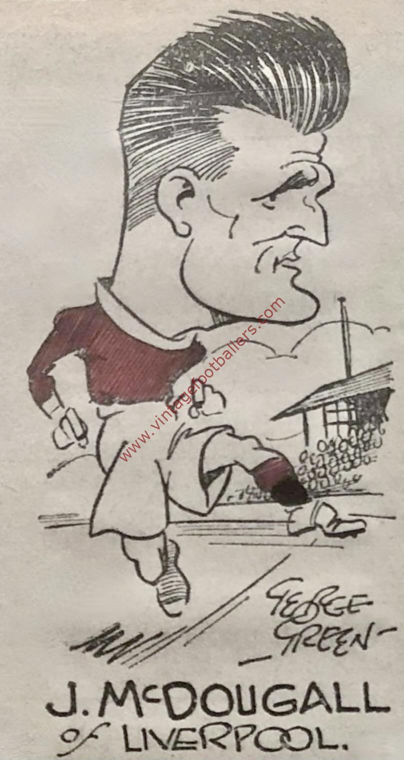 Towards the end of his debut season he switched to the half back line and he played the entire 1929-30 season at centre half, thereafter making the left half berth his own and he missed very few matches for The Reds through much of the 1930’s until he eventually lost his place in November 1937, having scored 12 goals in 357 matches for Liverpool. In 1938 he joined non league South Liverpool and played a season for them before his retirement in 1939. Following Liverpool’s game against Aston Villa at Anfield on 15th October 1938 McDougall was presented with a £650 cheque for “his loyalty and fine service as a player.”