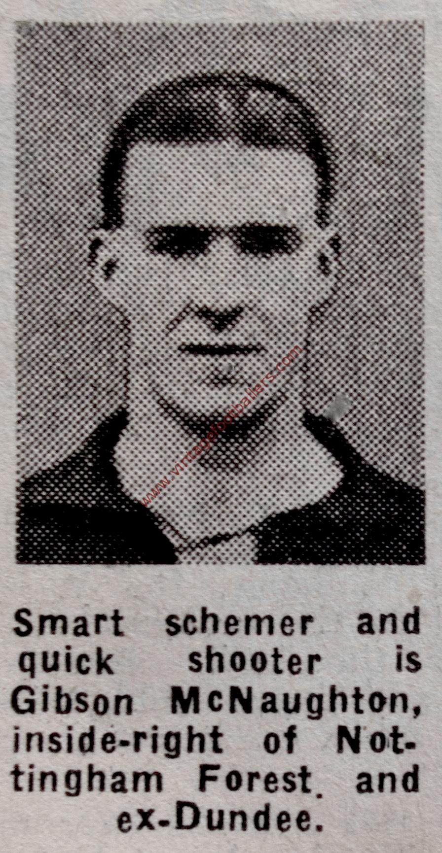 Broughty Ferry, Dundee born inside forward Gibby McNaughton joined local junior club Dundee Violet in 1932 before his first foray into Scottish League football with Clyde in 1933. He returned to his home town, signing with Dundee in 1934 where he scored 15 goals in 49 matches before joining Dunfermline Athletic in 1935 and East Fife early in 1936. In the 1936 close season he moved south to join Second Division Nottingham Forest, making his Football League debut against West Ham United that October.
