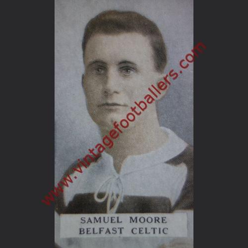 A real ninety-minute player, Derry born right half Sammy Moore took many a knock without giving-up, or his pace even waning, all the time with a smile upon his face. As an amateur he captained Belfast Celtic, he was a quiet and unassuming man off the pitch, “a genuine amateur… he would not even accept his tram fares” revealed club manager, Austin Donnelly. A product of Derry junior football, where he played for Derry Corinthians, he had joined Belfast Celtic in 1924 and won several trophies with them. He reportedly also declined a number of lucrative offers to leave Celtic Park. Formerly an Irish junior international, in 1925 he won Irish Amateur caps against England and South Africa and he played 6 times for The Irish League between 1924 and 1929.