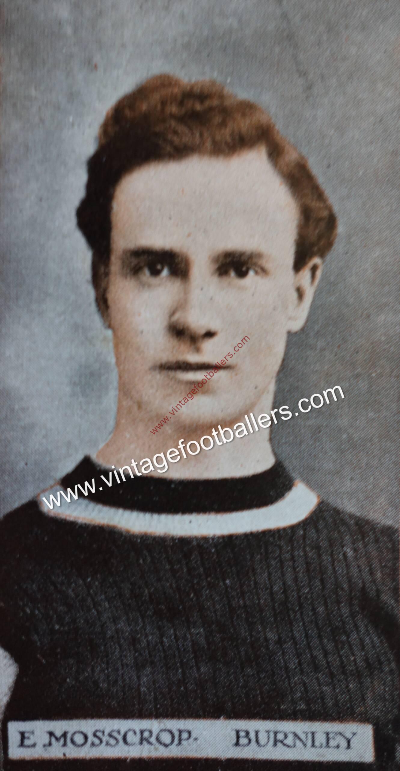 Southport, Lancashire born outside left Edwin “Eddie” Mosscrop joined Second Division Burnley from Southport Central in 1912, making his Football League debut against Glossop in September 1912. In his first season Burnley were promoted to the First Division finishing as Second Division runners up, and Burnley also reached the FA Cup semi finals, where they lost to Sunderland in a replay, although Mosscrop only made the team that drew the first match at Bramall Lane.