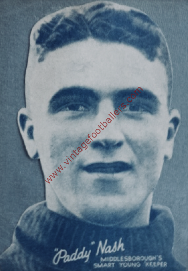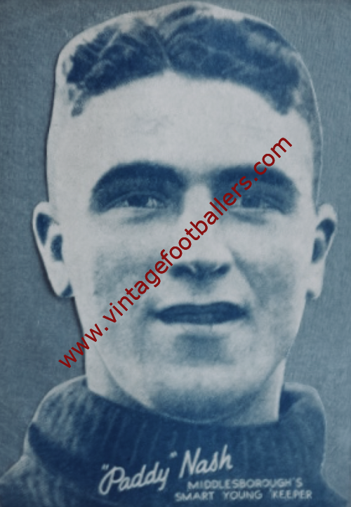 South Bank, Middlesbrough born goalkeeper Paddy Nash began his football career with South Bank East End and signed for hometown First Division club Middlesbrough in September 1937, making his Football League debut against Preston North End at the start of the following month. Nash retained the gloves during October and November before the return of regular keeper Dave Cumming, making in total 16 appearances for ‘Boro before the outbreak of the Second World War forced the abandonment of peacetime football in September 1939.