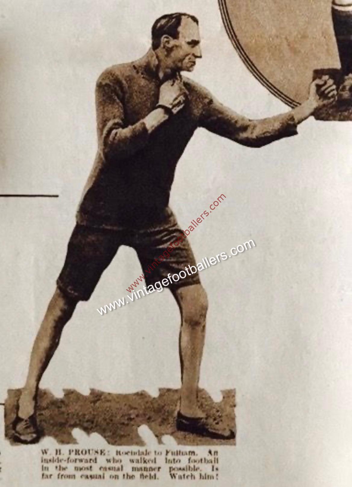Birmingham born inside right Bill Prouse had a trial with Plymouth Argyle after the end of the First World War before joining Redditch Town in 1920, playing for Dogpool in 1922 before signing for Third Division (North) Rochdale in November 1922, for whom he made his Football League a month later against Southport at Spotland in a fixture 2 days before Christmas that Rochdale won 3-2, with Prouse grabbing a brace. Although he only scored twice more that season, in 1923-24 his 14 League goals saw him share Rochdale’s leading goalscorer table with Bert Whitehurst, on the strength of which he was sold to Second Division Fulham in the summer of 1924 after 18 goals in 52 appearances for ‘Dale.