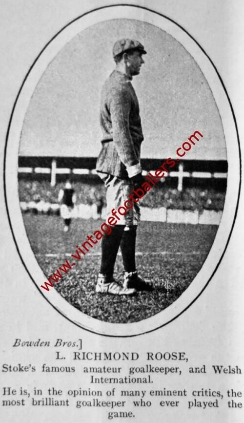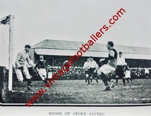 He played for Druids in 1900 and London Welsh between 1900 and 1901, before being signed by First Division club Stoke, for whom he made his Football League debut against Blackburn Rovers in October 1901. Roose made 89 appearances for The Potters from 1901 to 1904 and a further 70 from 1905 to September 1907, the latter spell being terminated by a broken wrist. Roose kept 40 clean sheets during his Stoke career, a remarkable record not least because his team flirted dangerously with relegation in 1901, 1902 and 1904. Roose punctuated his two spells at Stoke with 24 appearances for Everton. He arrived part way through the 1904-05 season and replaced the Irish goalkeeper Billy Scott, who had conceded 17 goals in the first 12 games of the season. Roose kept 8 clean sheets for Everton, a record proportionately better even than that he had set at Stoke, as Everton finished runners up in the League Championship. He also helped The Toffees reach the semi-final of the FA Cup in March 1905, where they were defeated in a replay at The City Ground, Nottingham by eventual winners Aston Villa.