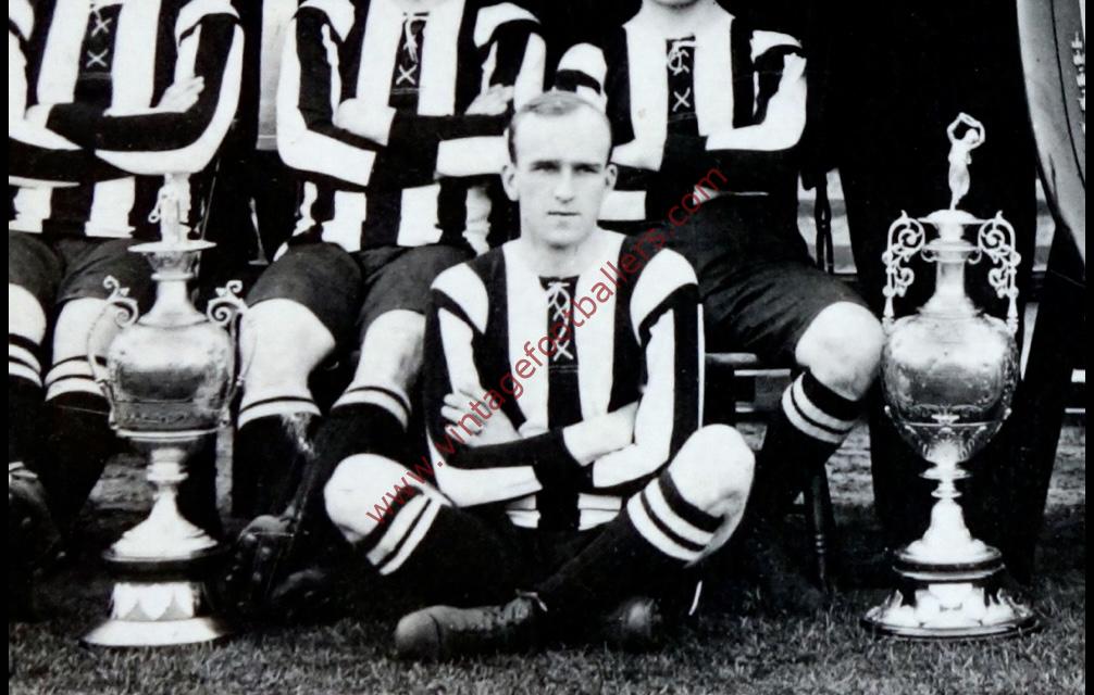 Born in Percy Main, North Shields, Northumberland, winger Jock Rutherford was known for his longevity; he played nearly six hundred Football League and FA Cup matches, despite four seasons of football being cancelled due to World War I. He started his career at Newcastle United, having joined them in January 1902 from Willington Athletic after starting with his local junior club Percy Main in 1899, making his Football League debut in 1902 against Bolton Wanderers in March 1902, scoring in a 4-1 victory. Nicknamed “the Newcastle flyer”, he spent ten seasons with The Magpies as a right winger renowned for his pace and close control. Newcastle were a dominant force at the time; Rutherford picked up three First Division Championship medals in 1905, 1907 and 1909, and played in five FA Cup finals (1905, 1906, 1908, 1910 and 1911) although Newcastle only won the 1910 final against Barnsley, winning 2-1 in a replay after a 1-1 draw; Rutherford himself scored the equaliser in the first match, in the very last minute of normal time.