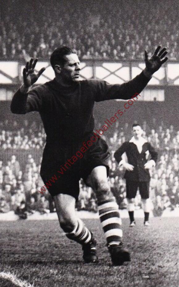 Brodsworth, Doncaster born goalkeeper Ted Sagar was known as a fearless goalkeeper of great ability. He joined Everton as an apprentice in March 1929 after playing for Thorne Colliery in 1928 and was initially understudy to Arthur Davies and Billy Coggins, making his Football League debut against Derby County in January 1930. He didn’t get a look in during 1930-31 as Coggins was an ever present, but from the start of the 1931-32 season Sagar had the gloves missing one game as Everton won the League title and he hardly let go of them for the next fifteen war interrupted seasons.