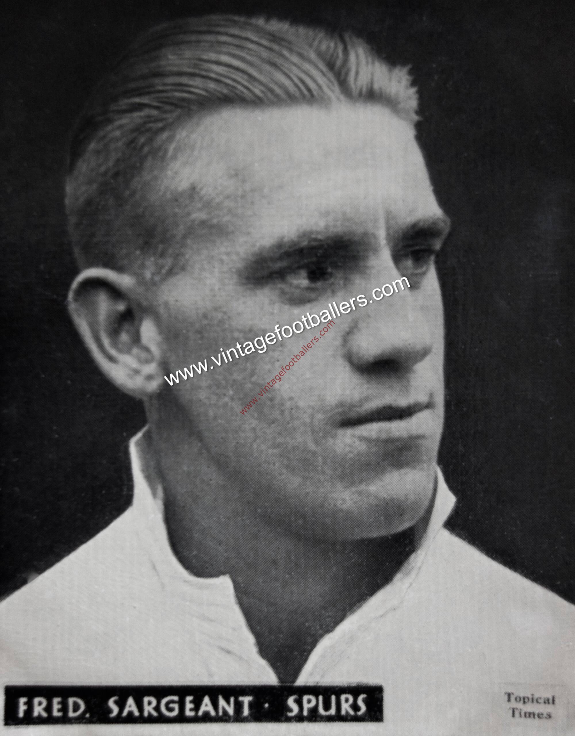 Islington, London born outside right Fred Sargent played junior football for Barnsbury in 1931 and Tufnell Park in 1932 before joining First Division Tottenham Hotspur as an amateur in 1933, being loaned to their nursery club Northfleet soon thereafter. After turning professional with Spurs he made his Football League debut at Derby County in September 1934, although this proved his only appearance in the top flight as he didn’t play again in a season in which Spurs were relegated.