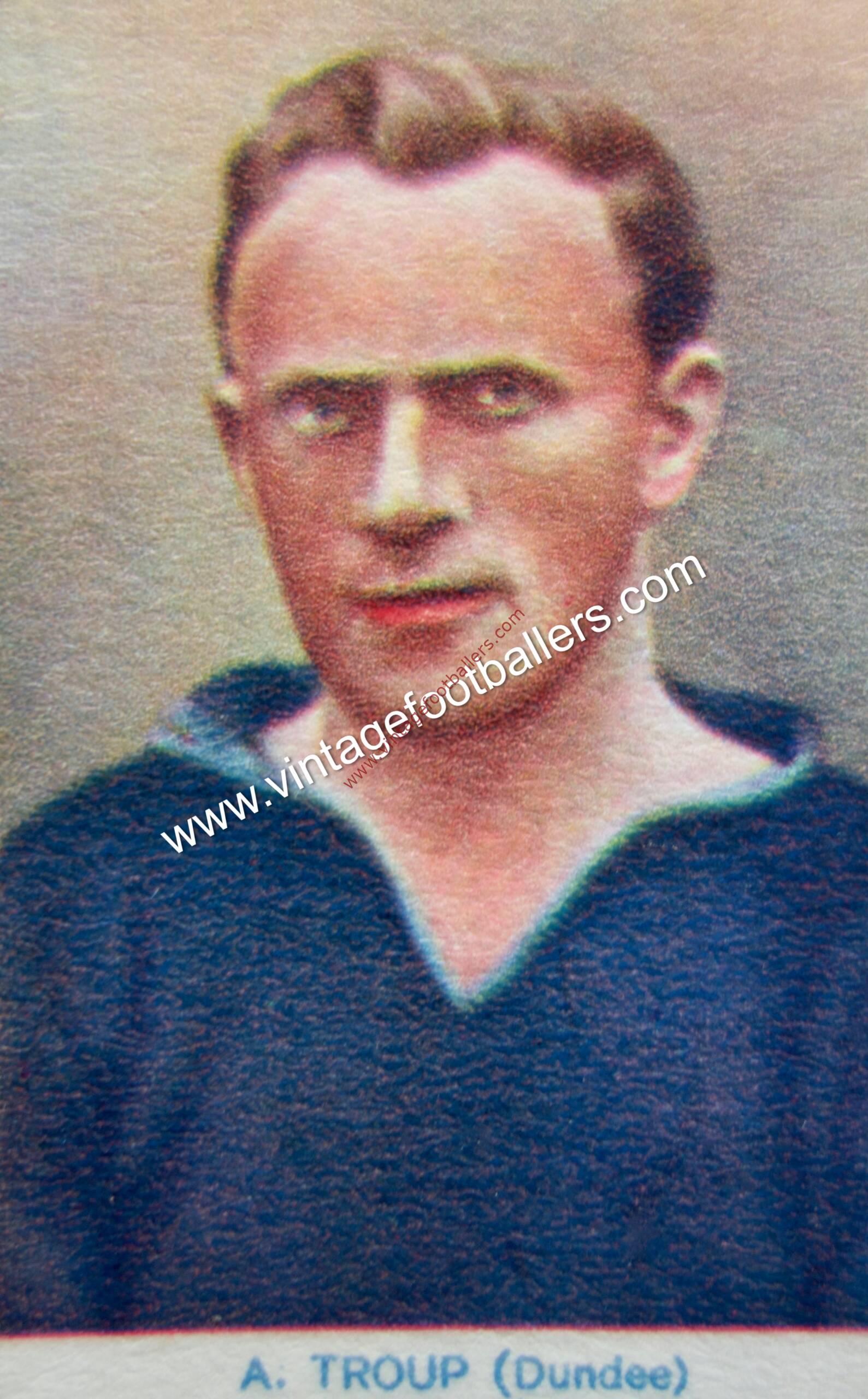He became a real hero of the people at Dens Park, being a wonderfully tricky winger whose sparkling play, gentlemanly demeanour, good humour and extremely likeable personality and was known as “Wee Troupie” due to his small stature. He won his first Scotland cap in April 1920 in a 5-4 defeat to England at Hillsborough. He won 3 more caps between February 1921 and March 1922. He first represented The Scottish League in January 1921 against The Irish League, winning his second cap that October against the same opposition, both games finishing in 3-0 victories.