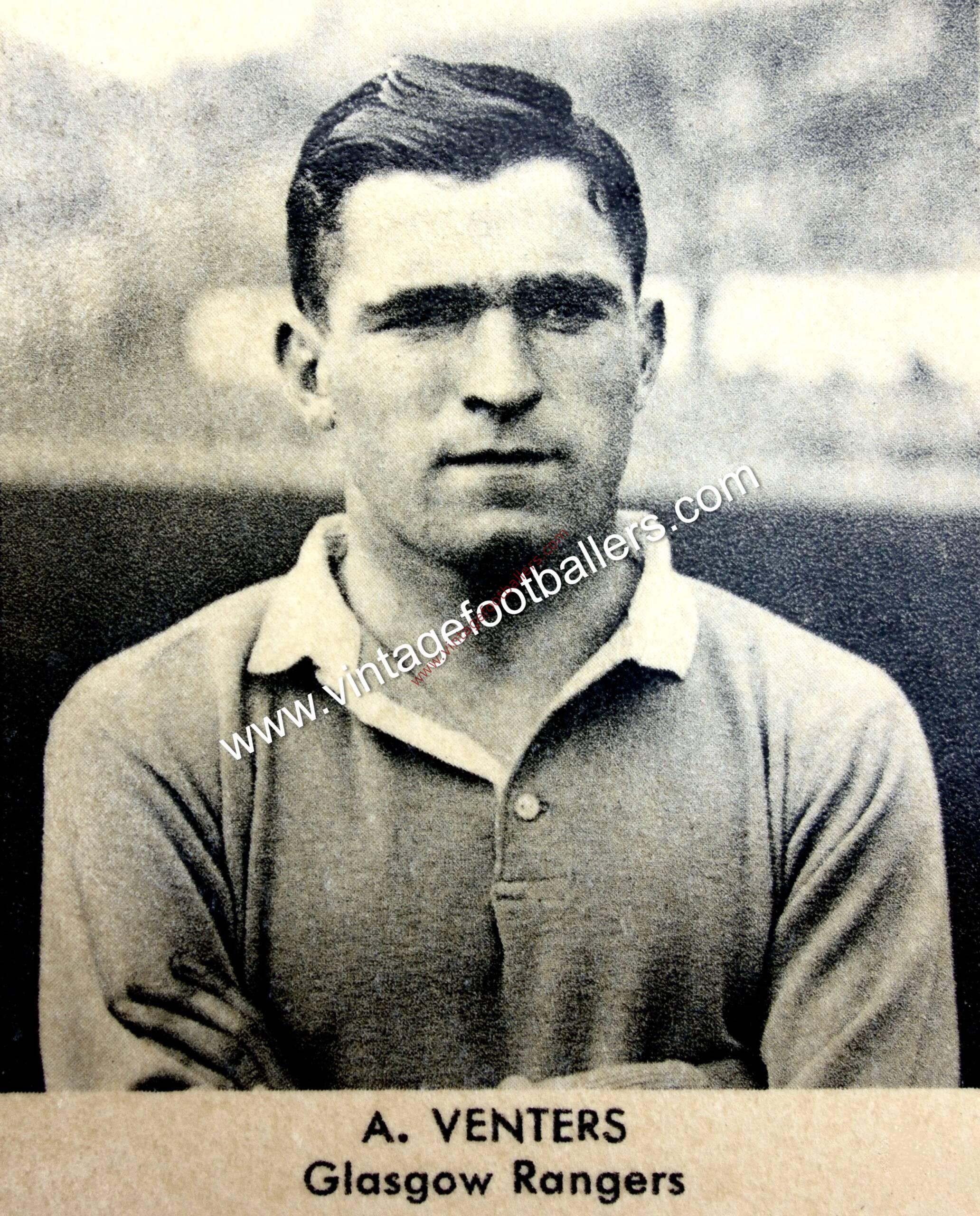 Cowdenbeath, Fife born inside forward Alec Venters played for Scottish junior clubs Southend Rovers in 1928 and St Andrews United in 1929 before joining Scottish League Cowdenbeath, where he made quite a sensation as a teenage prodigy. Indeed he won his first cap for Scotland when still a Cowdenbeath player in a 2-1 defeat to Ireland at Parkhead in September 1933, just turned 20 years old, before being signed by Glasgow Rangers in November 1933. He made his Rangers debut against Falkirk the same month, and helped them to win three Scottish League Championships in 1935, 1937 and 1939, when he scored 35 League goals in their successful campaign. In addition he played as Rangers beat Hamilton Academical 2-1 in the 1935 Scottish Cup Final and Third Lanark in the 1936 Final, before the Second World War severely curtailed his football career.