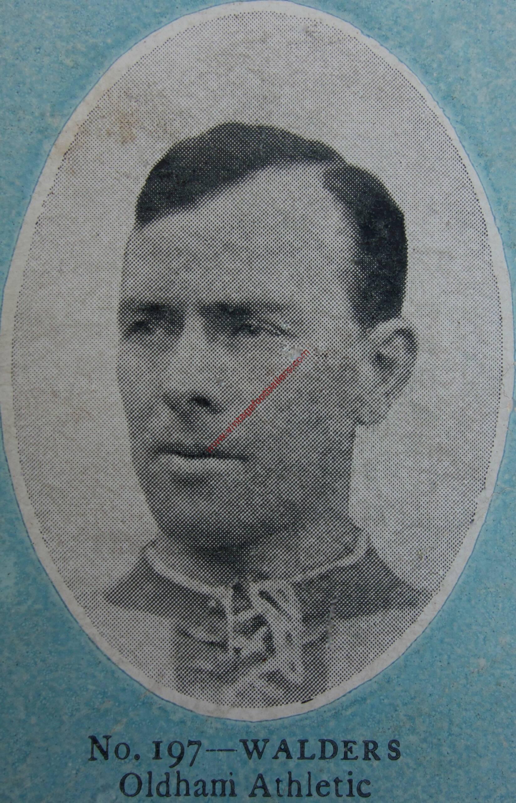 Described in 1907 as “a fine player, Walders knows the art of breaking up an opposing combination and is a capital shot at goal”, Walders captained The Latics in Oldham’s first League season after they joined the Football League in 1907, and helped Oldham to promotion to the top flight in 1909-10 as Second Division runners up. But he lost his regular place in their first team in November 1911 and only featured three more times before joining Southport Central in 1913 after 8 goals in 122 appearances during their League era. During the First World War, he returned to play for Burnley as a wartime guest player.
