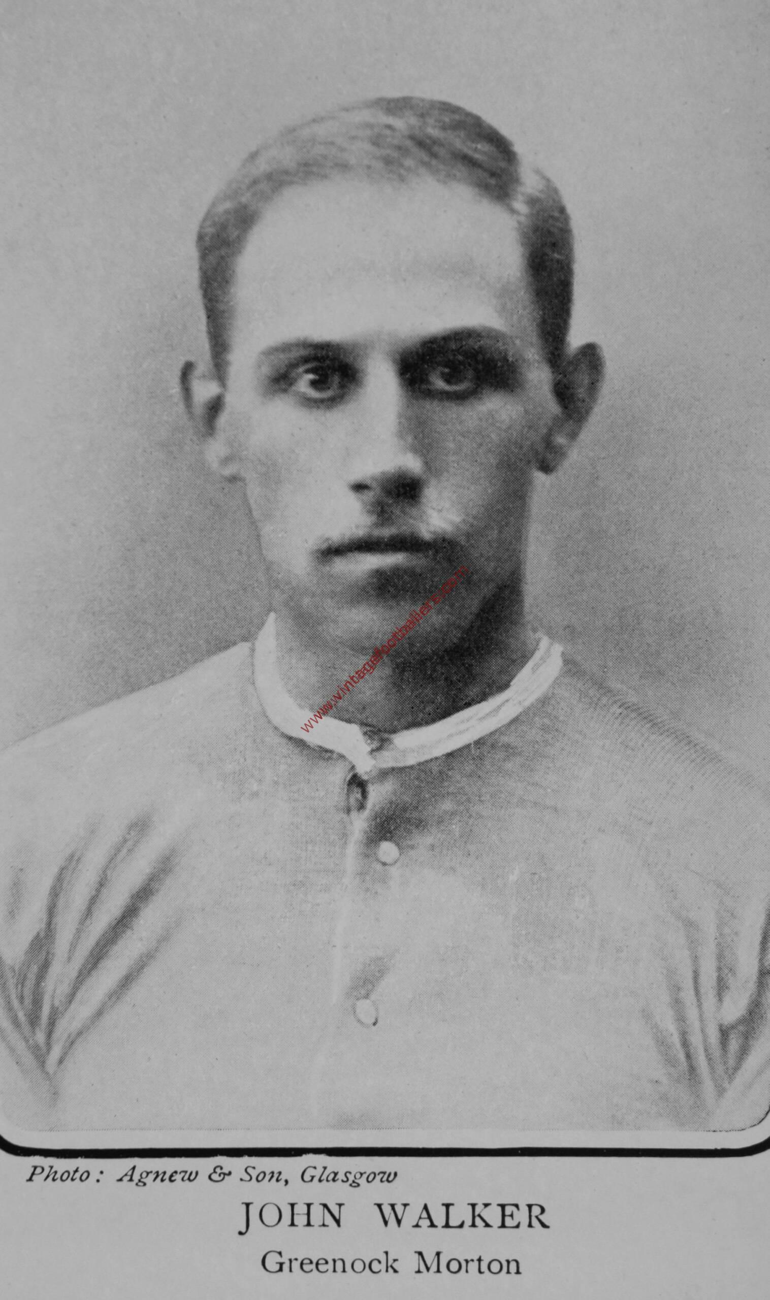 Coatbridge, Lanarkshire born inside forward Johnny Walker began his football career with Scottish League Armadale in 1891 and joined Heart of Midlothian in February 1893, making his Hearts debut at St Mirren the same month. He proved a tremendous success at Hearts, winning the Scottish League with them in 1895 and 1897 and the Scottish Cup in 1896 which he lifted as captain as they beat Hibernian 3-1 in the Final at New Logie Green, Edinburgh (the home of St Bernard’s), the only time the Final has been held outside of Glasgow. He had also made his Scotland debut against Ireland at Parkhead on 30th March 1895, scoring twice in a 3-1 win, the first of five caps he won through to 1904, when, as a Rangers player, he was recalled for the internationals against Wales and Ireland that March after a 6 year absence. He also scored against Wales in a 2-2 draw at The Racecourse Ground, Wrexham, in March 1897. He made two appearances for The Scottish League, both against The Football League, in 1896 and 1897, and was similarly recalled in March 1903 while at Rangers, winning 3 further Scottish League caps through to April 1904.
