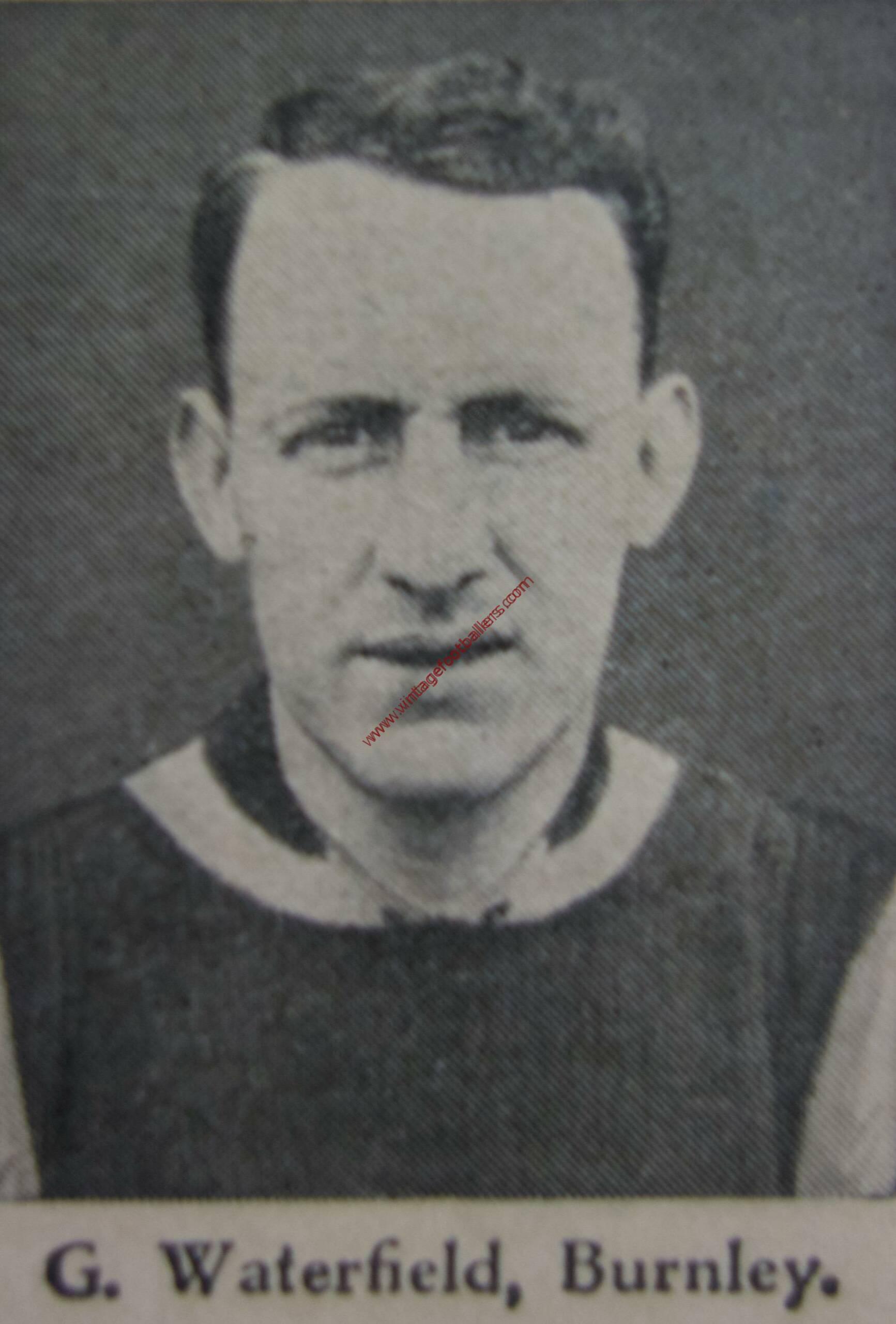 Originally an outside left, Swinton, Yorkshire born left back George Waterfield began his career playing with Swinton in 1921 and played for Mexborough Town in 1922 from where he was signed by First Division Burnley in October 1923 for £450, his Football League debut coming the same month against Sheffield United. From Boxing Day 1924 he converted to a left back and spent the rest of his career in that position, being an ever present in 1927-28 and becoming Burnley’s club captain.