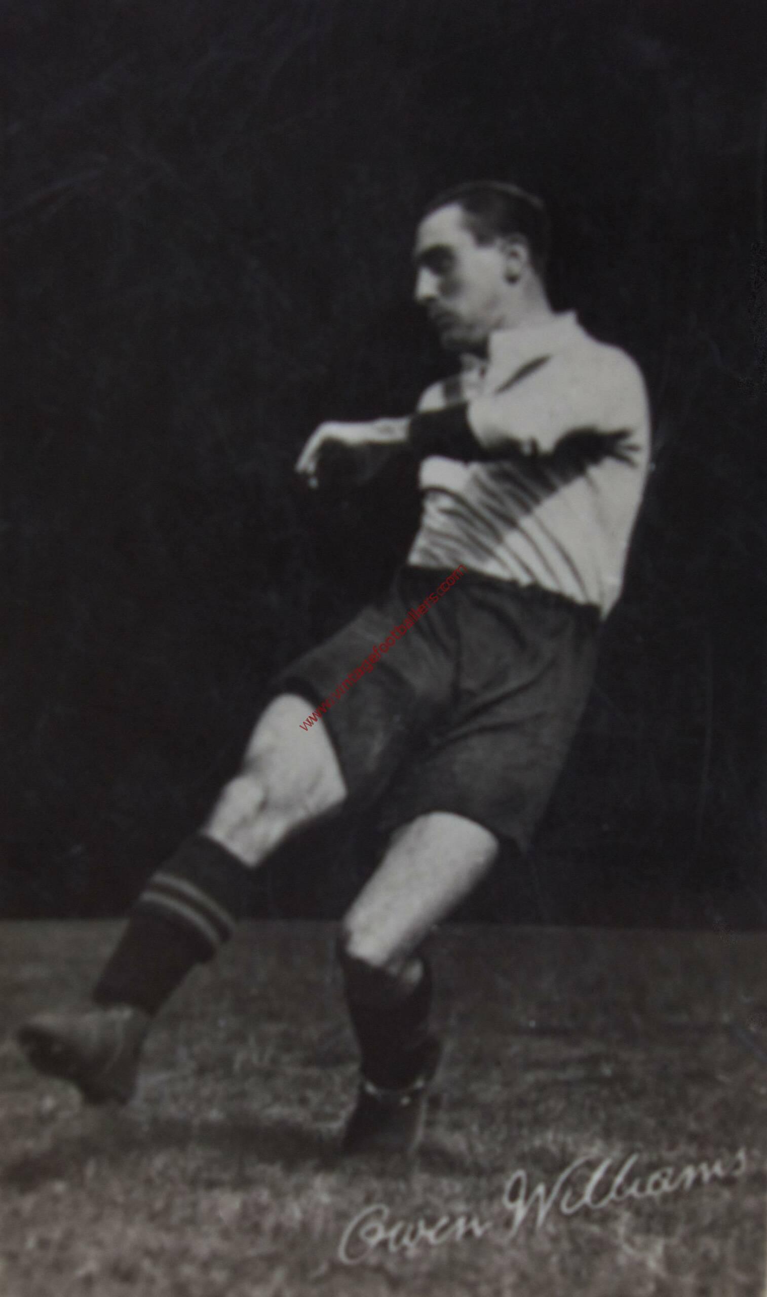 Ryhope, Sunderland born outside left Owen Williams started his football career in 1913 with Ryhope Colliery and had trials with Sunderland and Manchester United, also playing for Easington Colliery Welfare in 1915. After the First World War he made his name at Second Division club Clapton Orient, whom he joined in July 1919, making his Football League debut against Wolverhampton Wanderers that September, and for whom he scored 35 goals in 170 games over the next five seasons, Williams missing only two matches as they finished seventh in the division in 1920-21.