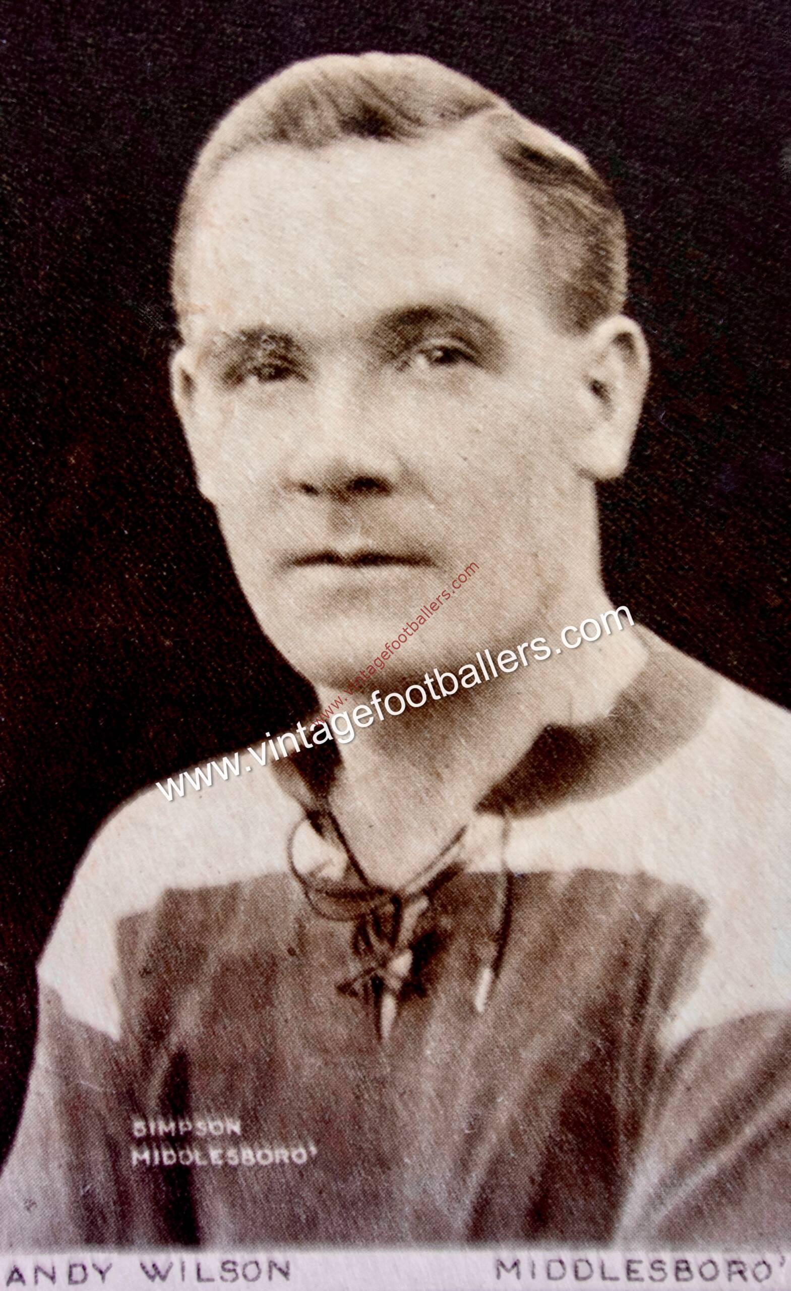 Newmains, Lanarkshire born inside forward Andy Wilson really was one of the biggest 2 or 3 star names in football in the early-mid 1920’s. Middlesbrough signed him from Cambuslang Rangers in 1914 and he made his Football League debut in January 1915 at West Bromwich Albion, playing only 8 games, scoring 5 goals including a brace on his home debut against Everton, before hostilities intervened and peacetime football was suspended. He returned to Scotland in between his First World War service in the trenches (he later wore a glove to mask his hand which had been shattered by a bullet to hide the disfiguration), playing for Hamilton Academical in 1916, Hearts, where he scored 32 goals in 33 appearances between January 1918 and May 1919, and for Dunfermline, but when Dunfermline joined the Scottish Football League in 1921, Wilson returned to Middlesbrough who still held his registration from before the War. In his first season back at ‘Boro he scored 32 League goals in 35 games including hat-tricks against West Bromwich Albion in a 3-2 victory in September 1921 and in a 4-1 win over Manchester City in February 1922.
