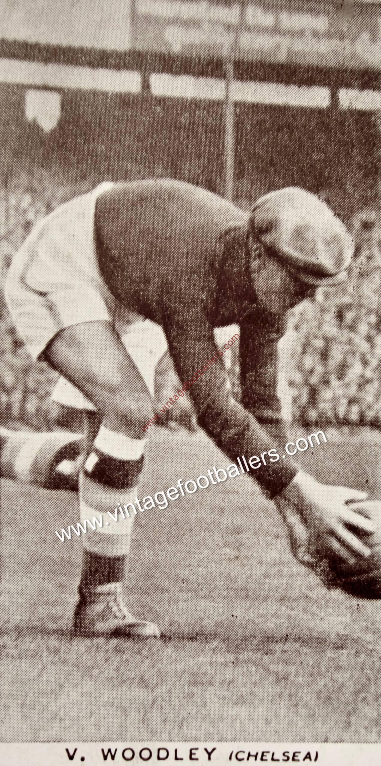 Burnham, Buckinghamshire Vic Woodley born goalkeeper began his football career with Cippenham in 1928, playing for Spartan League Windsor & Eton in 1929, having trials with Chelsea and Aldershot before he signed for Chelsea in May 1931. He made his Football League debut that August at Middlesbrough and after 7 appearances in his debut season he was an ever present in 1932-33. He was Chelsea’s principal goalkeeper throughout the 1930’s seeing off the challenge of Scottish international keeper Johnny Jackson, and making 275 appearances in total for The Pensioners in a career curtailed by the Second World War.